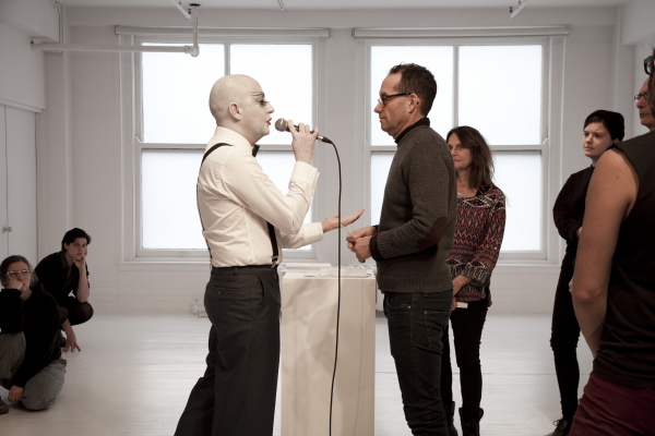 For Milisković, the Intruder is someone who infiltrates a particular group of people with the aim of understanding and even ‘colonising’ them. In his words, the Intruder’s aim is “to adapt, assimilate as well as to become a member of certain group but somehow, sooner or later, an intruder is unable to make it all the way through, becoming very suspicious as an element that doesn’t belong to the group, clearly interfering.” In this performance, the Intruder doesn’t fit in from the beginning, appearing before the audience in gender-ambiguous stage make-up and quirky, albeit masculine clothing—a bow tie and suspenders. He invades the viewers’ personal space, singing old-timey melancholic tunes such as Irving Berlin’s 1923 ballad “What’ll I do,” while staring directly into the eyes of one of the audience members.