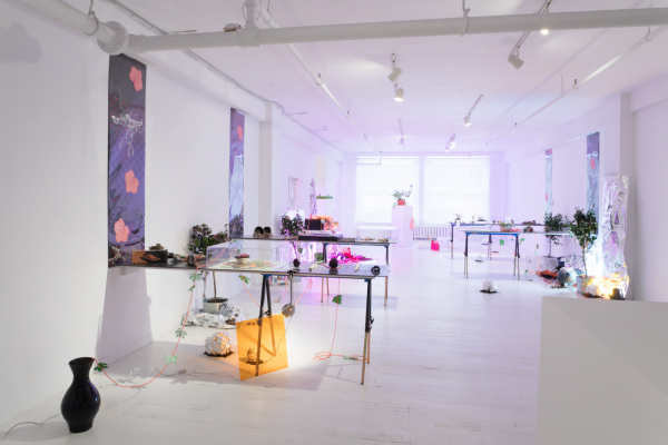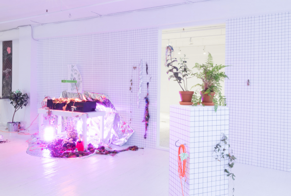 The installation presentation also explores the concept of the graft, making some elements coexist in the space to simulate scientific experimentation (Plexiglas boxes, grow lamps, video documentation), while others form a more traditional art exhibition (wallpaper, ceramic objects, large-scale drawings). Beyond the strange effect that emerges from this hybridization, Greffe-moi une fleur takes us back to Cynthia Dinan-Mitchell’s questioning of basically decorative displays while enabling her to re-examine one of her recurring preoccupations – the relationships that art has with nature.