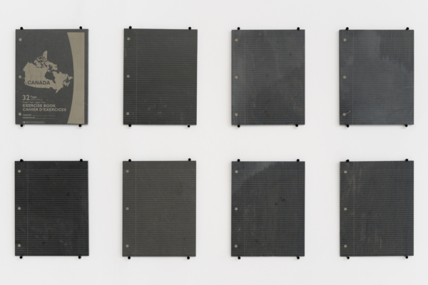This ensemble is complemented by a series of stationery items: Cahiers Canada engraved on slate slabs, files chiselled from pieces of quartz and dividers carved from marble. The combinations are arranged on the gallery walls in grids that refer to the organization of our computer screens, with all their files stored in virtual folders. The most impressive work in the corpus consists of 52 weekly time cards. The daily timelines, etched into the veins of the marble, demonstrate the controlling effect that the punch clock has on our over-calculated daily lives. Our occupations as art workers are thus linked to the hierarchical verticality of stone monuments and, in particular, the legacy of archaic sculptural ideals.