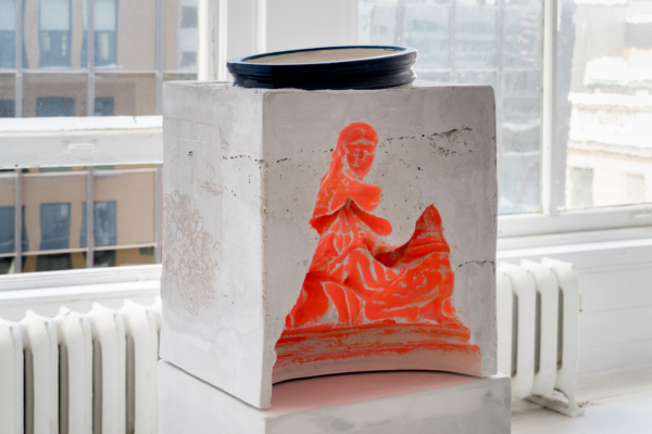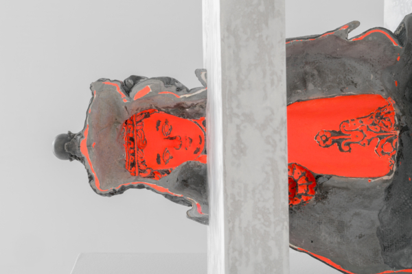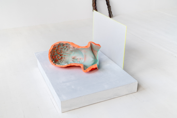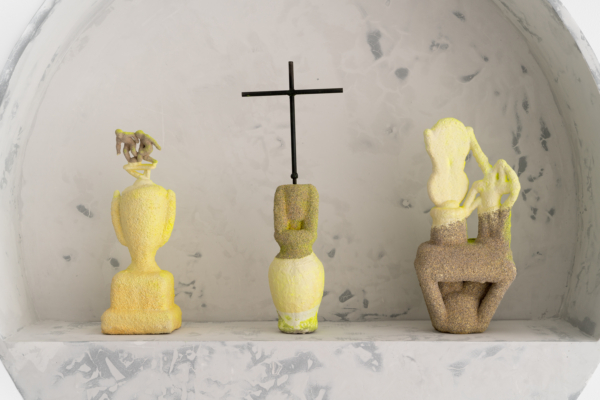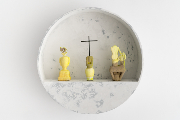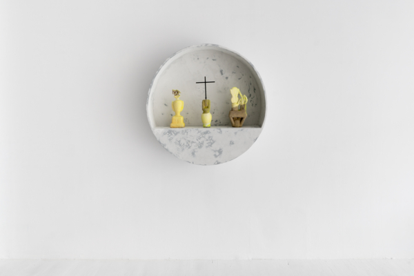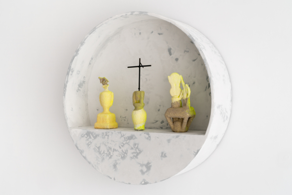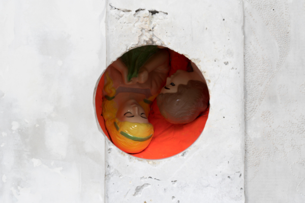 Andrée-Anne Carrier procède par inversion, d’une part pour donner ses lettres de noblesse au domaine de la construction, d’autre part pour planter la statuaire classique dans le quotidien, voire le domestique. Ainsi, l’artiste renverse-t-elle les codes du sacré avec ceux du banal, dans une expression artistique qui ne manque pas d’humour. Dans l’œuvre L’Architecte des curiosités rencontre la jeune fille au chapeau, il est difficile de voir la statue colorée insérée, à l’envers, dans un cube de plâtre crayeux. Témoin d’une urbanité froide et uniforme, ce cube l’aurait-il engloutie? Au détour de l’œuvre, le spectateur pourra apercevoir les personnages enfouis, faisant presque l’expérience d’une découverte archéologique. L’œuvre Gagnant. Perdant. Tricheur. présente une série de trophées trempés dans un mélange de céramique liquide et de sable, substance réfractaire servant dans le processus de moulage à la cire perdue et utilisée pour la coulée du bronze. Cette substance sablonneuse. ne peut que faire penser aux amphores antiques couvertes d’une épaisse couche d’argile. Mais sous le revêtement poreux, pas question de bronze; les trophées sont en plastique. Ces reliques contemporaines ne présenteraient-elles pas un patrimoine matériel et immatériel en devenir?
