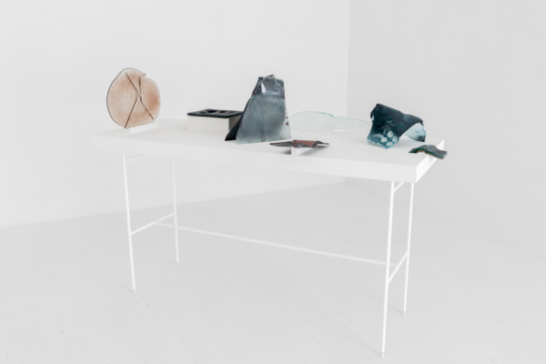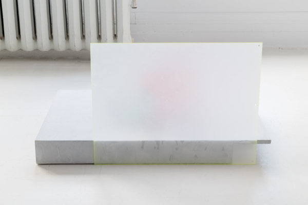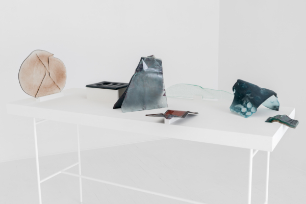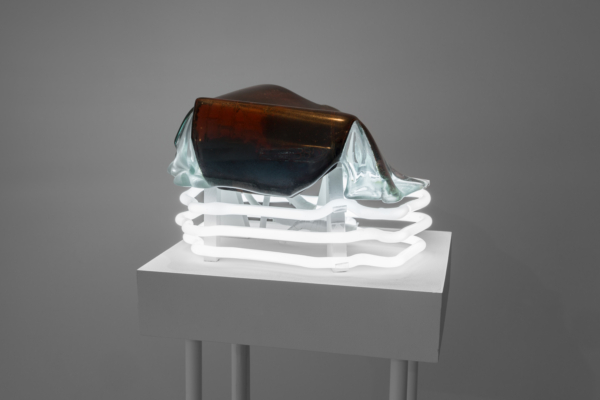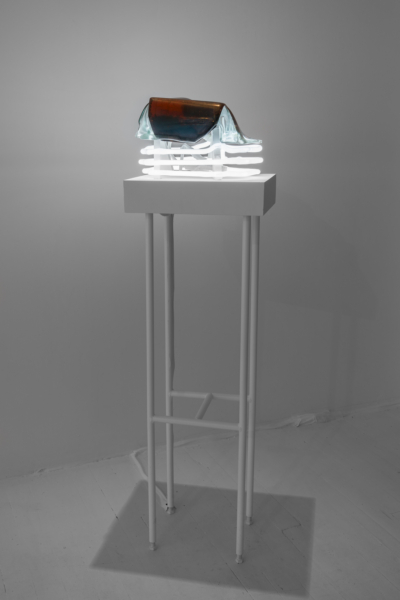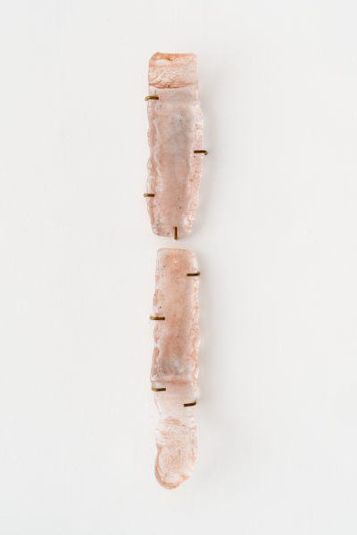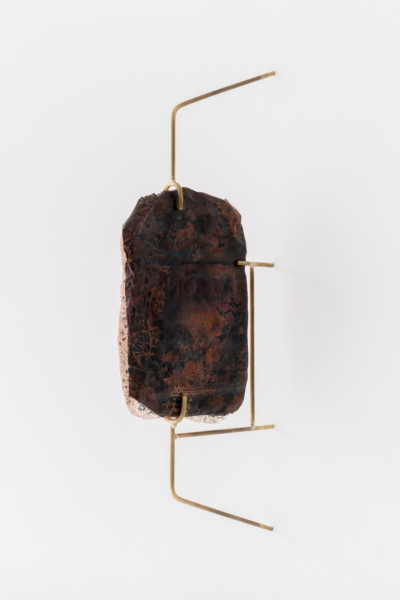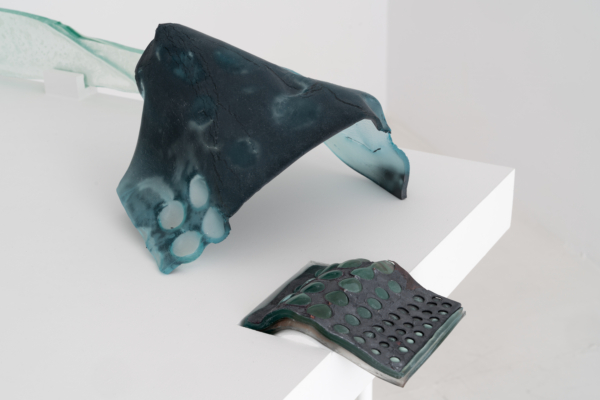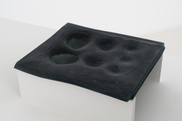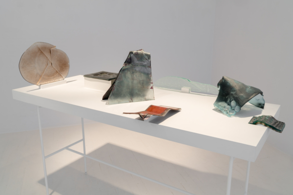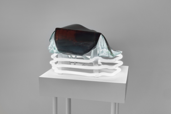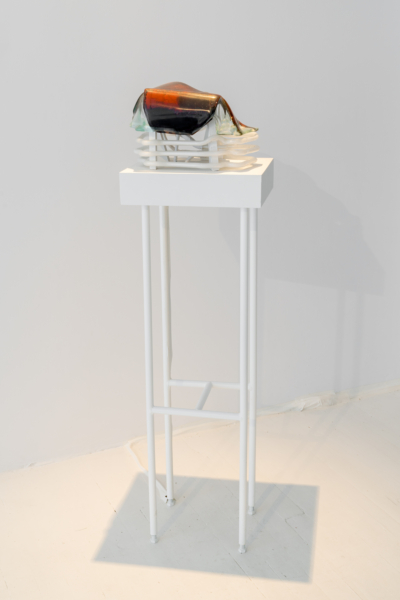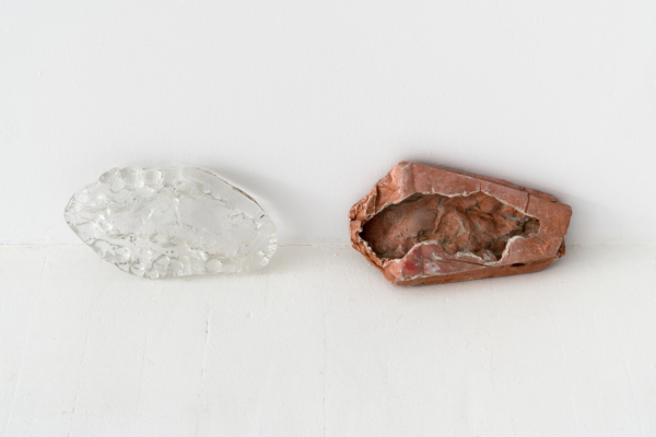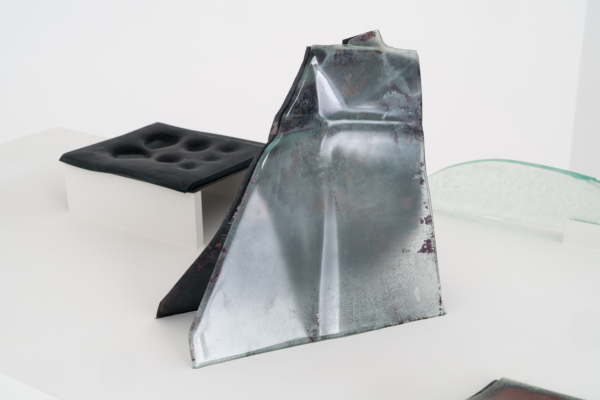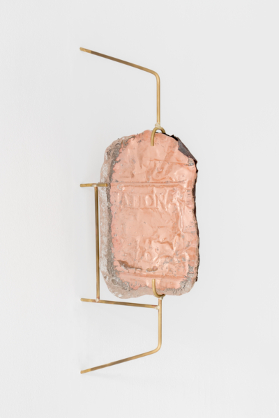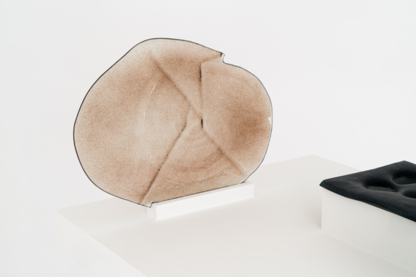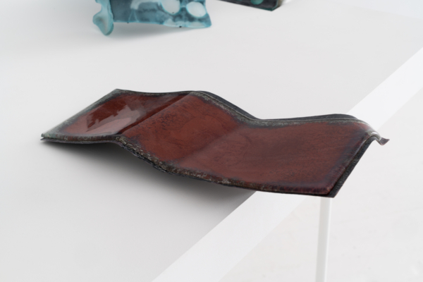 Annie Conceicao-Rivet engage quant à elle un dialogue entre le verre et le cuivre, deux matières rarement mises en présence. Un certain lâcher-prise s’impose alors à l’artiste. Rien ne sert d’anticiper la forme que les sculptures prendront; les matières dictent leurs règles dans un travail d’empreintes et de superposition de couches. Le corpus présenté propose entre autres une rencontre entre des plaques de cuivre gravées que l’artiste a récupérées dans son atelier de gravure et du verre thermoformé qui constitue l’objet de récentes recherches initiées par son projet Chercher à effacer la lumière. Les œuvres de ce corpus poussent les limites physiques du verre afin d’observer sa réaction au contact des plaques. Comment s’adapte-t-il au cuivre? Comment compose-t-il sa propre empreinte à partir de celle d’un autre matériau? Il y a derrière ce travail de prise de forme une volonté de rendre visible l’invisible, mais aussi de faire œuvre de mémoire. Plus que cela, l’union entre ces deux matériaux permet à la matière de se révéler, voire d’apparaître sous une nouvelle forme et d’évoquer une nouvelle matérialité.