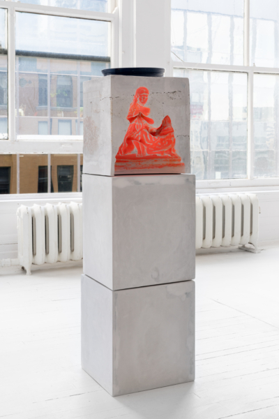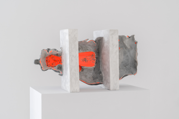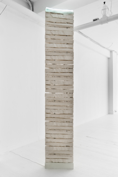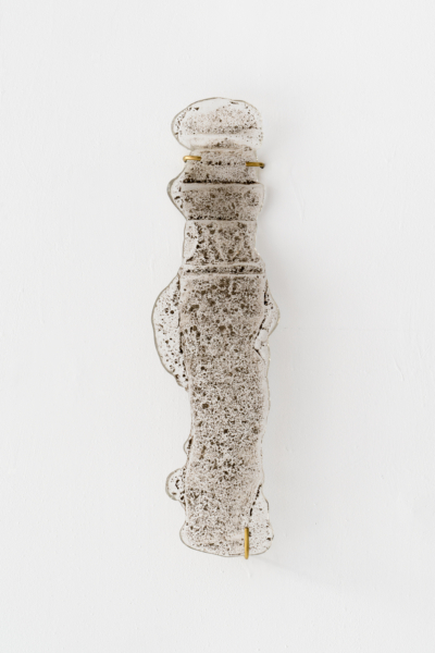 Alexia Laferté Coutu ancre également son propos dans des perspectives patrimoniale et architecturale, mais en utilisant le bâti historique. Ses œuvres sont autant d’empreintes qui se nourrissent d’un lieu spécifique et d’un moment précis. Avec ce nouveau corpus en verre coulé, c’est le Londres du milieu du XIXe siècle qu’elle révèle. En se promenant dans la ville, l’artiste fut séduite par des fontaine à boire de l’époque victorienne, conçues dans une perspective rédemptrice à la suite de l’épidémie de choléra de 1853. En appliquant de l’argile sur certaines parties de ces mobiliers urbains, à la manière d’un cataplasme, « thérapeutique ancienne qui consiste à appliquer sur une partie du corps un mélange d’argile et de plantes ayant la propriété d’absorber les toxines »1, elle pose alors un geste indiciel, riche et singulier. Son geste curateur rejoint donc l’histoire même de la fonction du monument sur lequel il est appliqué. Ces empreintes ont été par la suite moulées, avant d’y couler du verre, redoublant la vocation esthétisante d’un objet à la fois architectural et sculptural qui ponctue la cartographie de la ville.