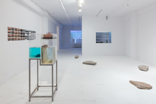 Le talent de Lyons réside dans sa capacité à nous transporter avec lui hors des murs de la galerie. C’est avec la posture de l’artiste en archéologue qu’il a exploré le Six-Mile Mill, un site oublié situé à dix kilomètres de Kamloops en Colombie-Britannique. C’est à cet endroit, sur les ruines de l’ancienne fabrique qu’il a réalisé une intervention directement sur les pierres de la fondation en les polissant comme s’il les apprêtait pour réaliser une lithographie. C’est la captation de ce lieu et de cette action qui est présentée dans la vidéo New Monuments/Old Foundations. Face à l’image en mouvement de la vidéo, le spectateur expérimente des temps parallèles, tel qu’on peut l’observer chez Bill Viola. Ces différents temps sont liés au passé de l’usine, à l’action de l’artiste et à la présentation dans la galerie d’objets issus de ce site. La cohabitation de ces temporalités met sous tension une série de dualités, notamment celle du passé industriel par opposition au présent artistique. L’environnement sonore de la vidéo envahit également la galerie. On y entend le son du frottement des pierres l’une contre l’autre ainsi que le bruissement des herbes, ce qui contribue à l’impression générale de déplacement physique et temporel. Il s’agit d’une invitation à être ailleurs et à prendre une pause et percevoir le temps de façon plus lente qu’à l’habitude.