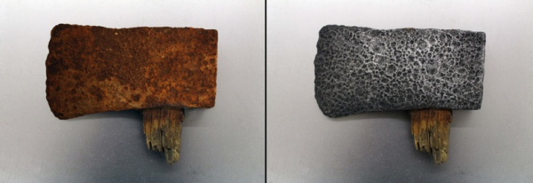 Dans le corpus A Modern Cult of Monuments, l’artiste a opéré sur divers artefacts un traitement chimique aux effets opposés. Certains ont été minutieusement trempés dans l’acide, puis retirés et gravés afin de souligner les empreintes de corrosions. D’autres ont été artificiellement corrodés et nous apparaissent méconnaissables. Face à ces objets, le visiteur se trouve confondu sur leur temporalité réelle. Cette illisibilité installe une tension et des questions surgissent : d’où proviennent ces objets ? à quoi ont-ils servi ? à quelle période de notre ère ont-ils été utilisés ? Contrairement aux archéologues et aux historiens, l’artiste n’offre pas de réponses. Il nous invite plutôt à inventer des possibles pour ces objets et à nous questionner sur ce qui adviendra des objets de notre quotidien.