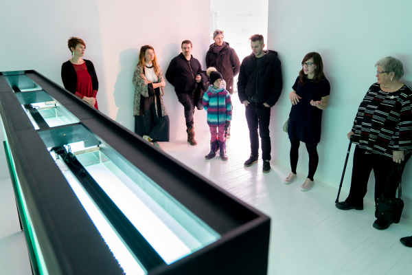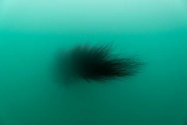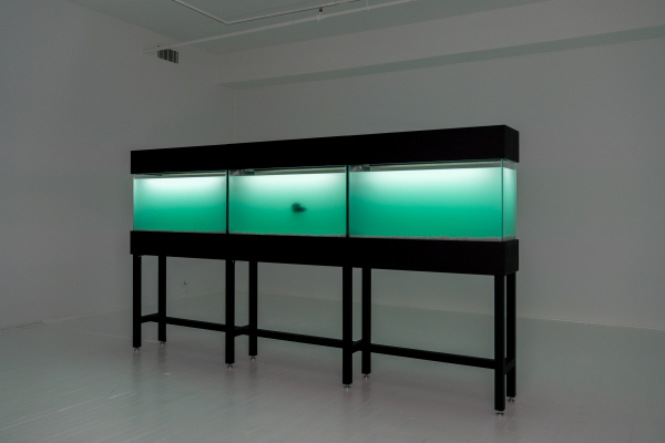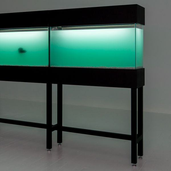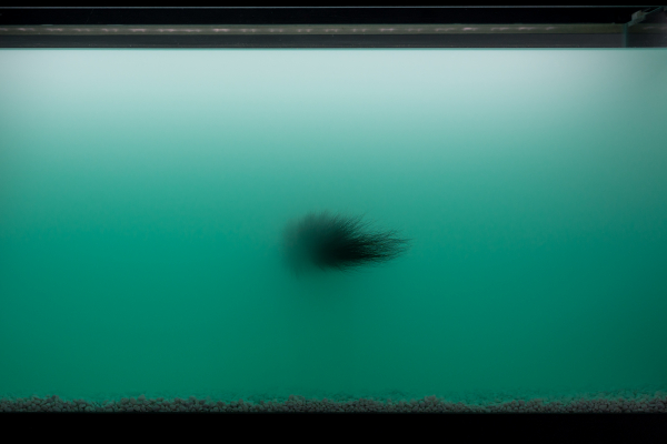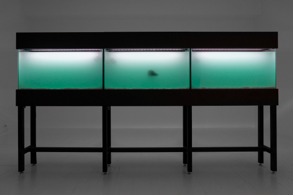 Conçue à partir d’observations in situ et de recherches issues de l’éthologie, À perpétuité nous invite à pénétrer dans un espace immersif qui semble hors du temps. L’installation est composée de trois aquariums plongés dans l’obscurité dans lesquels se meuvent des spécimens non identifiés. Une eau trouble de teinte turquoise voile et sublime tout à la fois la présence de ces curieux animaux. S’agit-il de mammifères aquatiques? Nul ne saurait le confirmer avec certitude. Quelques instants suffisent toutefois pour que la fascination cède place à la perplexité : ce qui se présentait de prime abord comme étant un dispositif familier se révèle plutôt être une présence inquiétante. Semblant en proie à une forme de folie, les animaux effectuent des cercles réguliers sans jamais s’arrêter. Payette met ainsi en scène une vision précisément faussée, ambiguë, autour de la problématique du vivant.