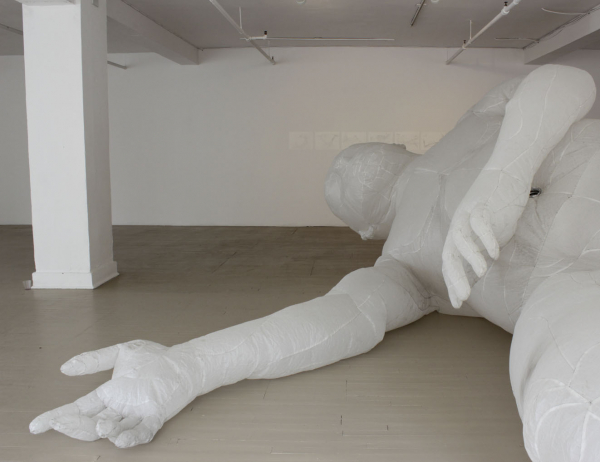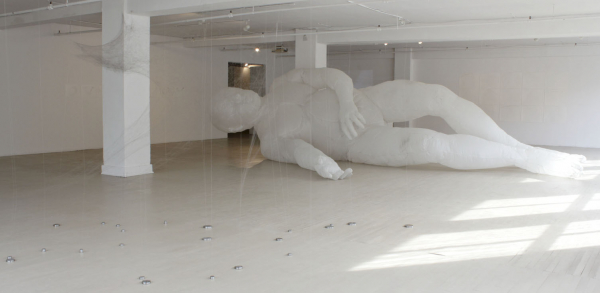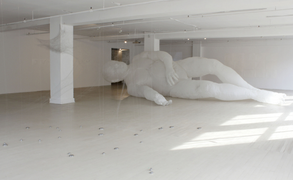 Le travail de Max Streicher fait appel à des formes gonflées fabriquées de membranes de tissus ultra-fins minitieusement découpées et assemblées. Les oeuvres représentent souvent des formes humaines, parfois de très grandes dimensions, et leurs titres se réfèrent à l’ancienne mythologie romaine. Des souffleurs gonflent les formes en leur donnant un aspect évocateur, le lent mouvement de l’inflation et de la déflation rappelant l’éveil et le déclin de la vie. L’usage qu’il fait du gonflement de formes se situe parmi les plus étonnant qu’il m’a été permis de découvrir et fut en fait, le déclencheur de ce projet. Silenus, l’oeuvre choisie pour cette exposition, est une oeuvre imposante; elle représente une forme humaine assoupie, mesure 6 mètres de long, touche au plafond de la galerie et crée ainsi un décalage d’échelle et de perspective pour le visiteur qui se tient à proximité. Cette oeuvre, quoique impressionnante par son échelle et la recherche de ses matériaux, est cependant la plus accessible pour le public et de nature à attirer un grand nombre de visiteurs à l’exposition.