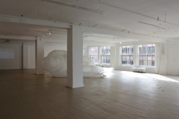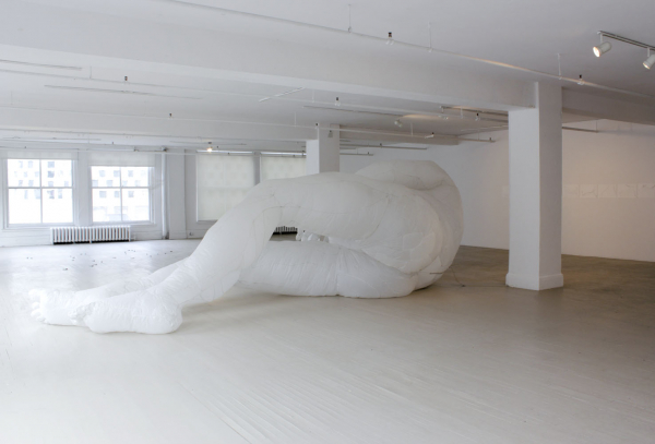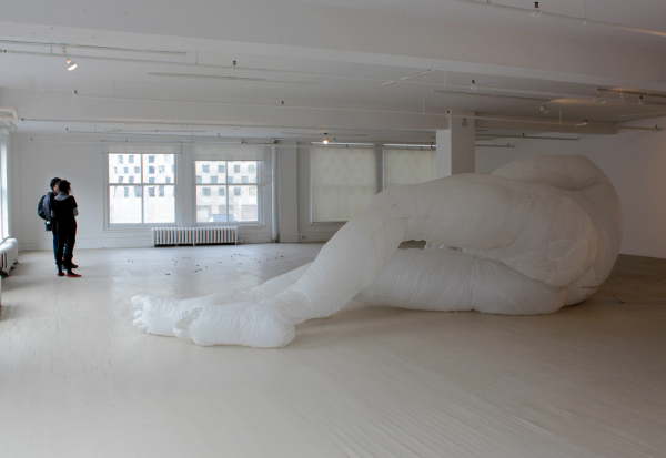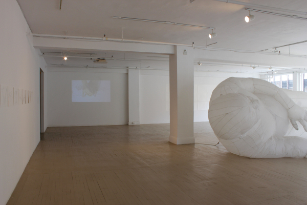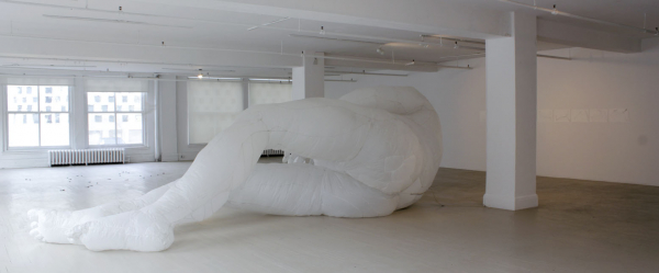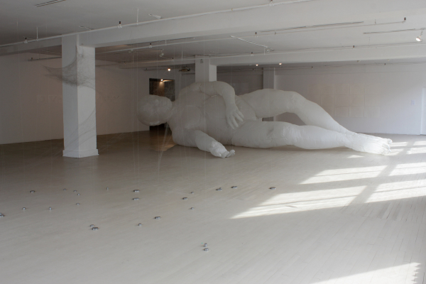 Quoique ayant peu en commun avec les subtils détails de Fuglem et de Lavaillante, le frappant travail de Silenus (en référence au tuteur enivré de Bacchus dans la mythologie grecque) utilise un minimum de matériel pour produire une forme imposante. Constituée uniquement d’une fine membrane de voile de spi gonflée d’air, l’oeuvre prend forme en vertu des propriétés d’un matériau invisible. Le cycle intermittent de la pompe à air donne l’illusion que Silenus respire et qu’il fait de pénibles efforts pour se relever du sol. L’oeuvre fait partie d’un large corpus dans lequel Streicher explore les possibilités formelles et conceptuelles des formes gonflées. Quoique assez imposant, Silenus, une fois dégonflé, se glisse dans une petite valise.