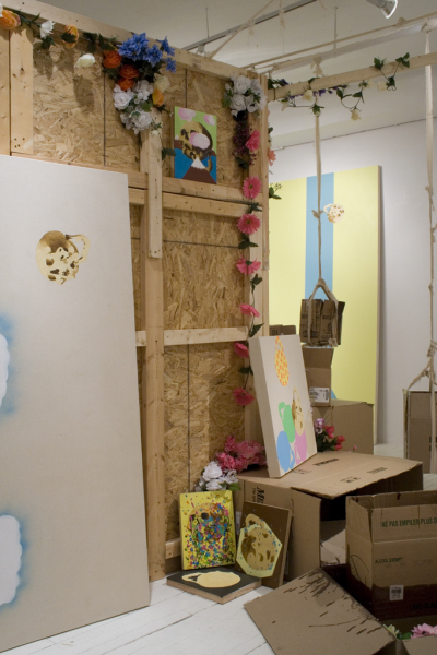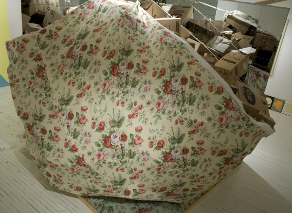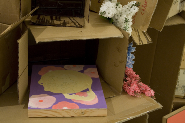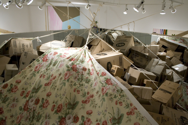 Tout comme une baglady à robe fleurie, Guillaume Clermont part de l’objet trouvé et utilise l’espace de la galerie comme un « fourre-tout ». Étant dépourvue de repères temporels et structuraux et ce, renforcé par la présence des miroirs, l’installation nous désarçonne : l’artiste nous met en boîte. Il désunit, disloque et sépare les composantes de l’installation de leur contexte habituel afin de proposer un questionnement sur la place familière où ils devraient se retrouver. Cette stratégie d’accumulation et de dislocation du discours est renforcée par l’ajout de l’eau dans les boîtes de cartons. Deux questions s’imposent : 1) comment le matériau de ces boîtes peut-il retenir l’eau? 2) À quoi font référence les fleurs de lotus que l’on remarque dans ces contenants? Considérant le fait que la fleur de lotus, pour les bouddhistes représente le cycle de la vie, puisqu’elle pousse dans des marécages, cette dernière nous ramène de façon poétique, au temps qui passe et aux tactiques que nous déployons pour le rattraper et le mettre, en vain, en boîte.