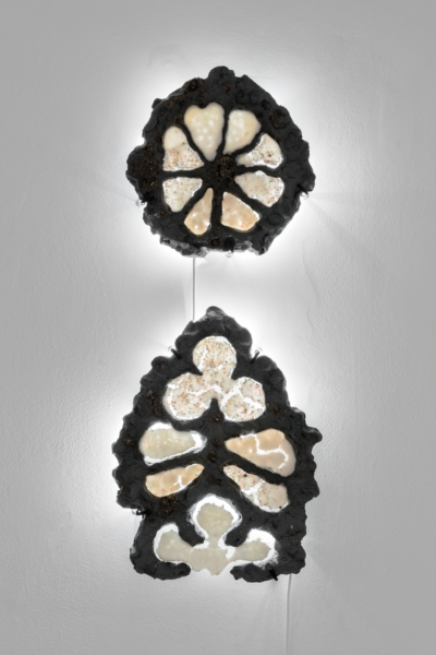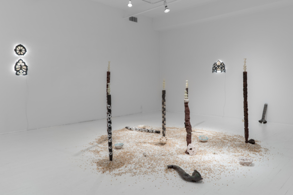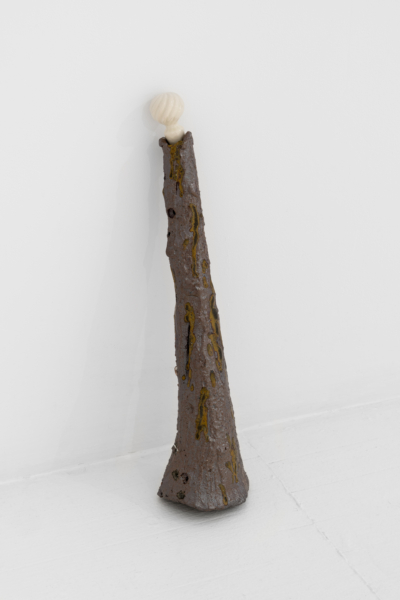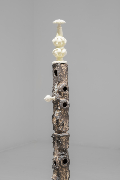 C’est en écho au cérémoniel que l’artiste reprend les codes de la musique à travers la disposition d’instruments placés ça et là. Des colonnes en céramique, percées d’ouvertures ornées de blanc, évoquent indéniablement les instruments à vent qui agissent comme des indices et des marqueurs du rituel. Ici s’érige une flute, là une trompette. Au sol, une forme saxophonesque confirme la lecture. Dans cette forêt cérémonielle, chaque colonne témoigne de sa similitude et, en même temps, de sa singularité grâce au traitement plastique des formes. Le contraste entre l’aspect brut de la partie centrale, et l’aspect raffiné de la partie supérieure, interpelle. Le brut évoquerait-il l’essence de la matière de toute chose, à l’instar du golem qui, composé d’argile, réfère à l’embryon, ou à l’inachevé? L’extrémité aux formes distinctes, lisses et irisées provenant de moulages de bouchons de carafes décoratifs, caractériserait-elle alors la différence et la singularité? La force du collectif relève de la singularité des voix et met en lumière les interventions humaines sur la nature. C’est dans ce même espace liminal que Xavier Orssaud opère un renversement ou un glissement narratif de la crise environnementale pour jouer sur la porosité des frontières entre l’esthétique d’un désastre annoncé et d’un renouveau espéré.