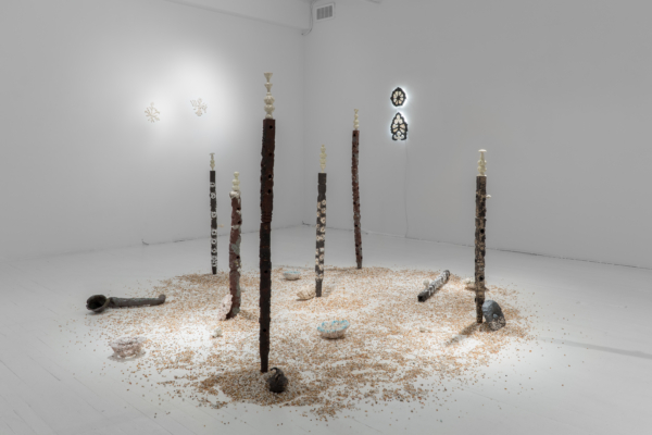 Au milieu d’un sol jonché de cailloux et d’objets épars, des formes élancées ponctuent l’installation. À première vue, il se dégage une esthétique brute de ce qui pourrait ressembler à des restes de troncs d’arbres calcinés, décimés par un incendie dévastateur. En même temps, la couleur terreuse des colonnes évoque un autre univers, celui de la ruine. Certains pourraient aisément évoquer le fait que ces objets font penser à d’éventuels trésors enfouis qui auraient pu être découverts par des archéologues, comme le masque posé au pied d’une colonne. Avec la présence d’un luffa posé sur le sol, l’univers marin n’est pas loin non plus. Les passionnés d’ostréiculture pourraient aussi voir dans les colonnes, les fameux poteaux permettant le foisonnement des huîtres ou autres coquillages. Mais ici, point d’huîtres ni de coquillages!