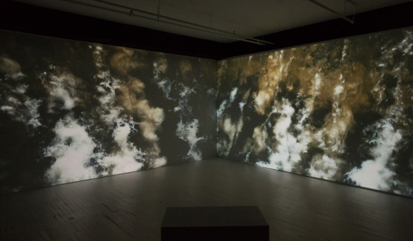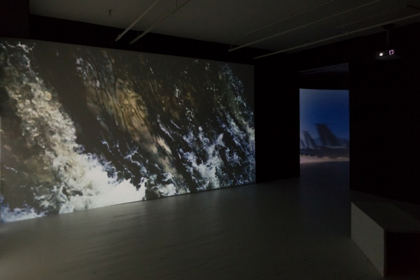La représentation minimale et fantomatique des éléments se fond au mouvement organique et électronique des images. Les effets non-naturalistes du montage interprètent une forme de disparition, voire la mort lente de l’originel dans le dispositif scénique. La temporalité de l’œuvre s’aligne sur le mouvement reléguant alors la nature à un décor inquiétant. Claustrophobie des grands espaces met en scène la complexité des effets inhérents à l’expérience des lieux. Les installations médiatiques produisent des environnements dont la portée sensible oscille entre l’enivrement et l’étouffement. Cette expérience se double d’une impression de distance et d’éloignement qui contraint le spectateur à une position méditative, voire à une prise de conscience du soi regardant.