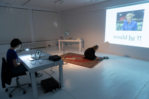 C’est d’abord le style autoritaire de l’ancienne première ministre [Margaret Thatcher] qui fait surface, et, très vite, on comprend que le thème exploré est celui des relations de pouvoir et de domination dans le langage parlé. Négatif, positif, tranchant, parasité… le langage est présenté dans sa puissance comme dans sa vulnérabilité, mais aussi dans son rapport au corps (le langage non verbal). La force de l’énonciation, au regard de sa situation, nous rappelle comment l’acte d’énoncer peut aussi performer. La performativité est le fait pour un signe linguistique (énoncé, phrase, verbe, etc.) d’être performatif, c’est-à-dire de réaliser lui-même ce qu’il énonce. Le fait de prononcer un de ces signes fait alors advenir une réalité. Le performatif est ainsi la façade linguistique de quelque chose de plus profond : la construction de réalités sociales.