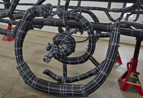 C’est ainsi que l’œuvre de fortune a débuté son existence en un dessin numérique d’un Westfalia. Cette esquisse lui a ensuite servi de patron et de guide pour sa construction en bois de grève. Durant plus d’une année et demie, l’artiste a parcouru les rives du Fleuve Saint-Laurent – près des municipalités de la Rivière-Ouelle et de Berthier-sur-Mer – afin d’y dénicher des morceaux de bois échoués compatibles avec les lignes et les courbes de son dessin de départ. Dans ce projet, l’artiste utilise le numérique sans les moyens de production qu’offrent les machines. Avec des moyens rudimentaires, il a dû laisser aller le contrôle de l’image parfaite. Les lignes blanches dessinées au crayon, qui reprennent l’idée du fil de fer, s’épuisent au fil de leur utilisation et marquent de façon irrégulière les surfaces noires. Les « glitchs » sont occasionnés par le matériau lui-même – le bois de grève – et ses limites à suivre le modèle de référence avec ses courbes parfaites et ses lignes droites.