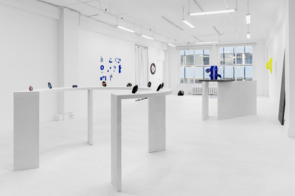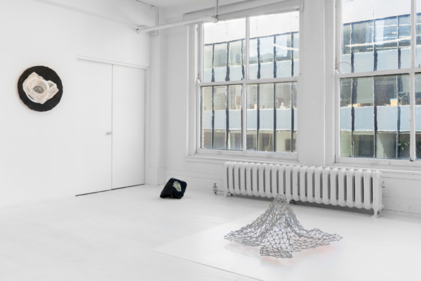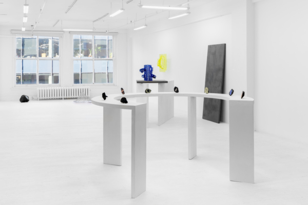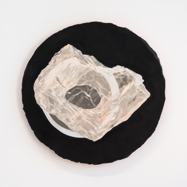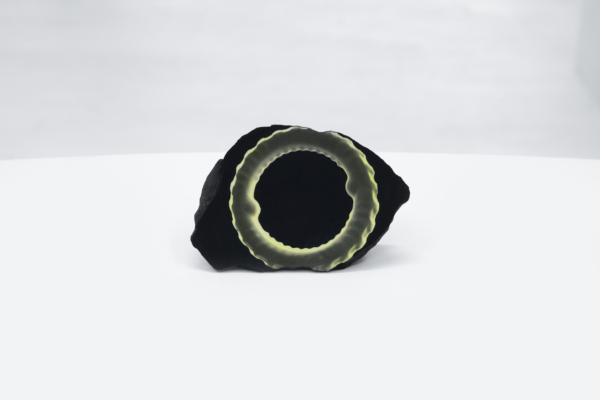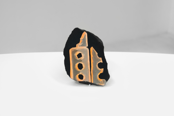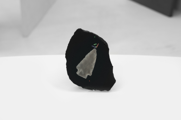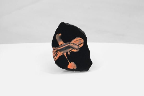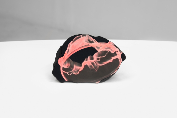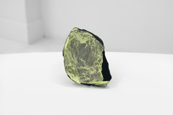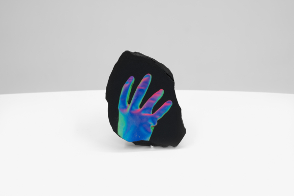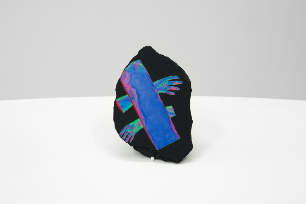 Au sein de cette exposition qui enchevêtre les temporalités, Andrée-Anne Carrier s’est intéressée à faire apparaître les états transitoires employés lors du passage de l’écran à l’objet ou de l’objet à l’écran. D’abord, les fossiles numériques, comme elle les désigne, sont réalisés à partir de captures d’écran d’objets numérisés puis transposés sur les pierres d’un gris anthracite. Semblables à des images radiographiques, les empreintes à échelle réduite se présentent comme des témoins de notre temps, des spécimens de la culture écranique. La multiplication des écrans et le dispositif circulaire qui nous encercle rappellent leur présence dominante dans nos vies et leur développement accéléré. Lueurs fluorescentes, effets de transparence et d’opacité, de flottement et d’aplanissement, de superposition, de retournement et de rotation proposent des investigations variées sur le trompe-l’œil, la matérialité de l’écran et la lumière vive qui en émane.