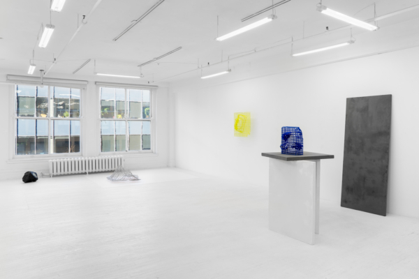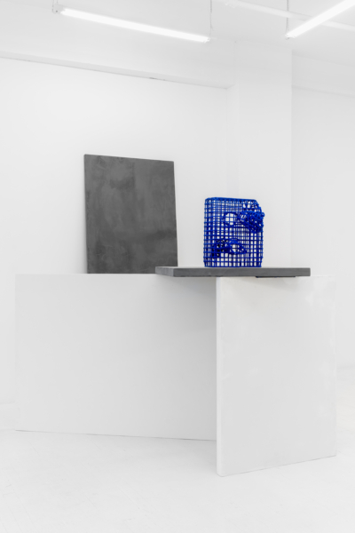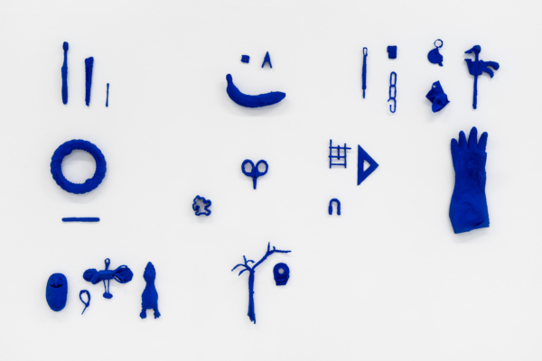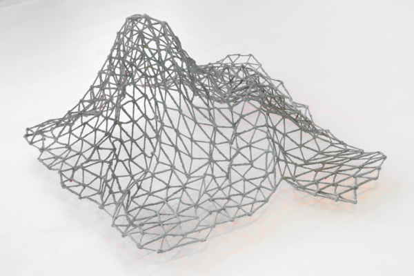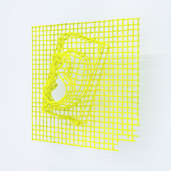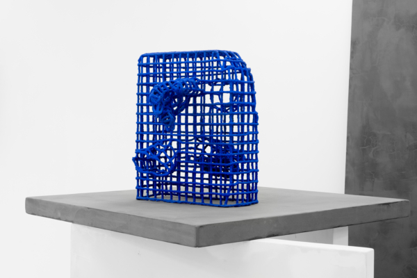 Ensuite, les objets multiples au fini sablonneux évoquant des vestiges matériels laissés par des individus ou des sociétés humaines sont formés grâce à une technique de trempage et d’accumulation de sable en surface. Faisant écran à l’objet, ce processus d’effacement vient aplanir les caractéristiques propres à l’objet, les mettre à plat. Ce jeu entre la matérialité et la dématérialisation est particulièrement saisissant dans les structures en grille aux tons clairs et obscurs qui rappellent le maillage 3D ou encore dans La collection du technophile qui regroupe une sélection d’outils entourant l’artiste au quotidien dans l’atelier. Grâce à diverses stratégies déployées par l’artiste et au déplacement du corps dans l’espace, un phénomène optique se produit et fait apparaître et disparaître les reliefs, le volume. Selon un certain angle, les visiteurs et visiteuses sont amené•e•s à faire l’expérience illusoire du passage de la forme 3D à celle 2D.