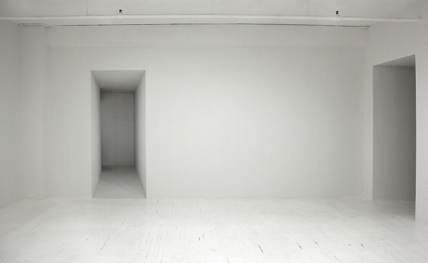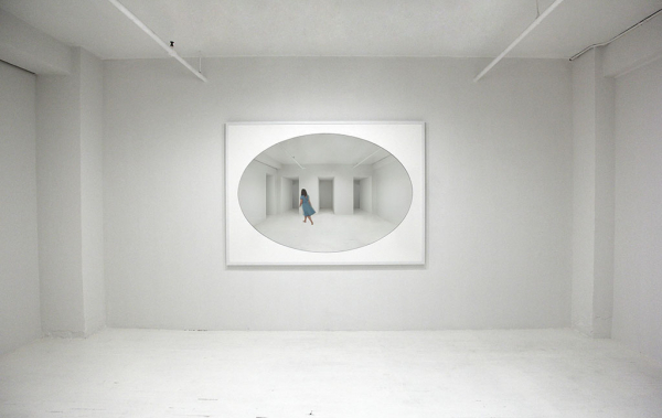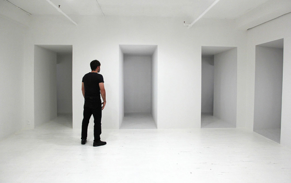 Si on se retourne, on constate que le passage par lequel nous avons accédé à la pièce a été dupliqué, plusieurs fois. Cinq photographies, qu’on prendrait volontiers pour d’autres passages en tous points semblables à celui que nous avons emprunté, sont positionnées sur le pourtour de la pièce. L’illusion est quasi-parfaite. On se croirait au centre d’une pièce «trouée» de nombreux accès. La petite salle, confinée, devient le coeur d’un labyrinthe, dès que notre oeil se «fige». Toutefois, dès qu’on bouge, les distorsions apparaissent et la fiction spatiale dans laquelle notre oeil s’est évadé, l’espace d’un instant, s’évanouit.