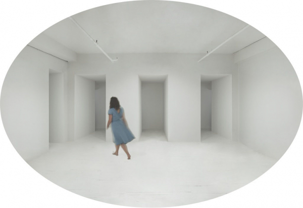 En entrant, un grand cadre blanc, ovale, nous accueille sur le mur d’en face. Dans le cadre, une image, représentant une pièce, qu’on associe rapidement à la pièce dans laquelle nous nous trouvons : même luminosité, mêmes proportions. Une silhouette de jeune femme, vue de trois-quarts dos, pieds nus, y esquisse un pas gracieux vers une des sorties. La jeune femme porte une robe bleue, cintrée, dont la jupe ample accentue le mouvement.