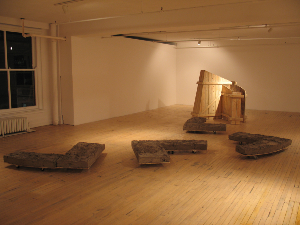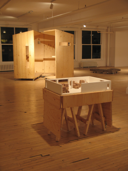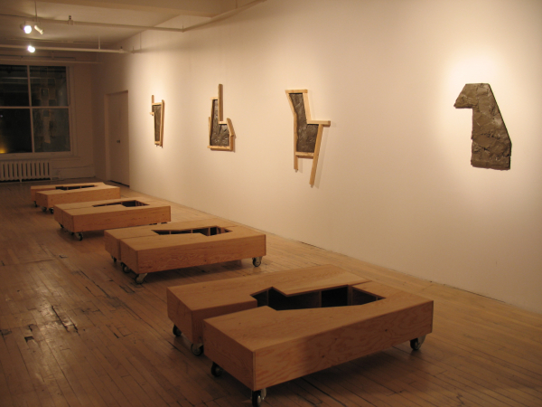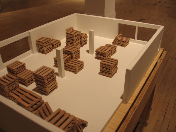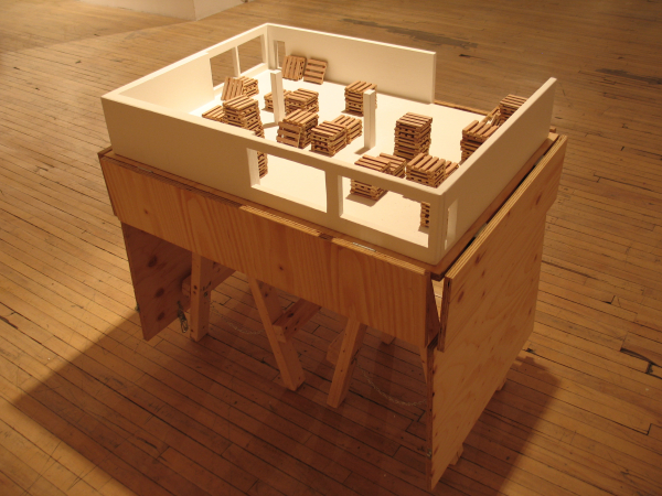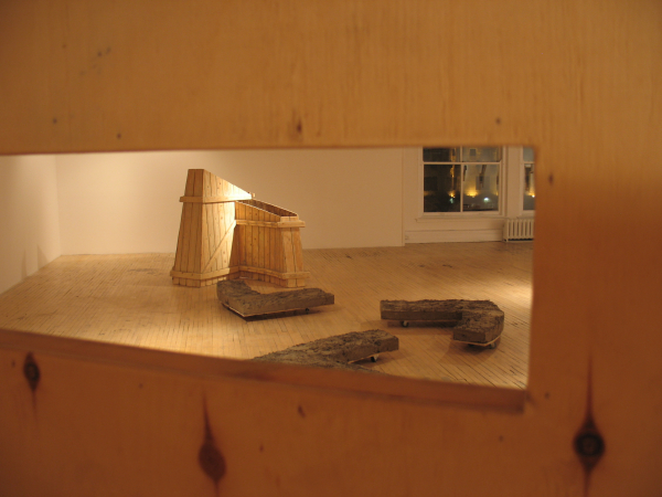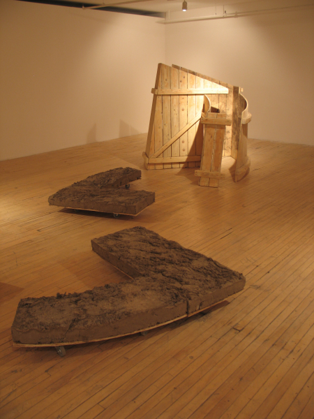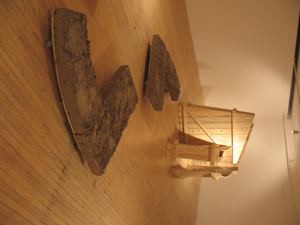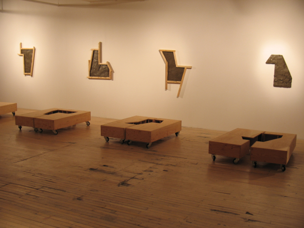 Ici, de minuscules palettes de manutention, icônes du transport de masse, acquièrent une charge hautement métaphorique de par leur petite taille. Là, des caisses sur roulettes transportant des morceaux de paysages archétypaux. Une construction vue des airs? Un petit bout de terre? Une allégorie des territoires parcourus et du souvenir qu’ils gravent dans la mémoire. Paradoxalement, plus loin, un observatoire mobile permet plutôt de transporter un regard méthodique et respectueux, circonscrit par des ouvertures qui isolent des portions de paysages comme pour y prêter une attention particulière. Après l’observation transportable et l’observatoire transporté, une autre posture est offerte: le fait de laisser sa trace. Telle une façon de laisser un souvenir de son passage mais aussi de se donner des repères, puisque chaque lieu visité participe à l’identité du promeneur, à sa mémoire et de facto, à son bagage.