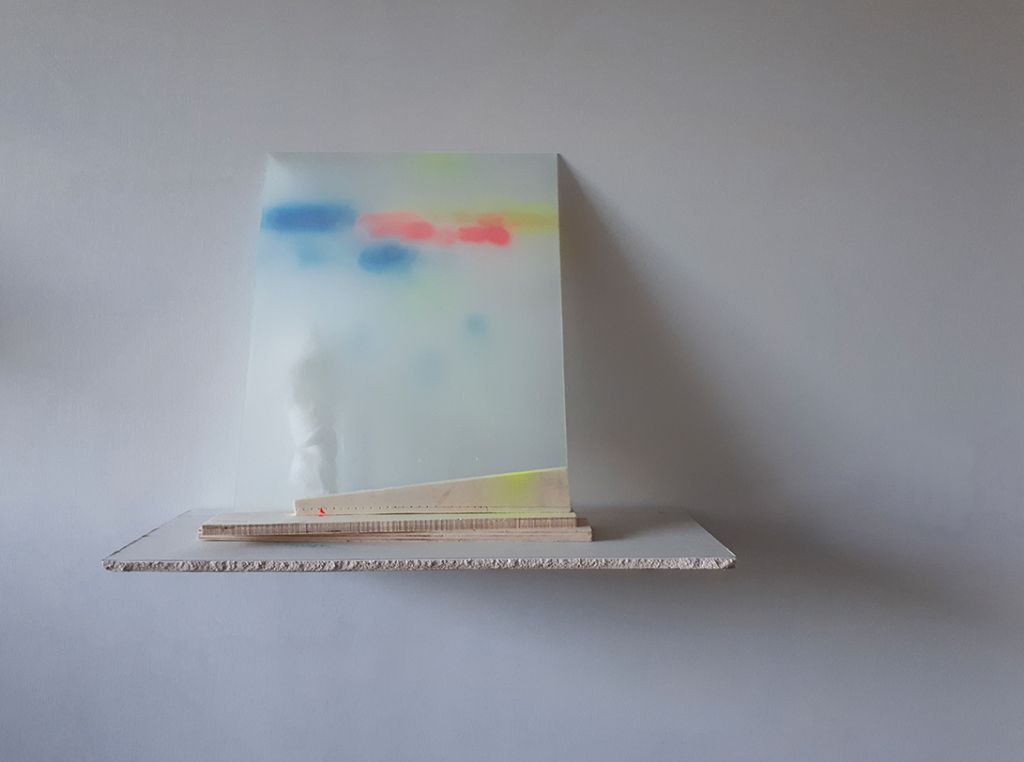 Andrée-Anne Carrier, Nature morte no 4 avec trophée de golf emballé, 2017, résine, pigments, plaque de verre, peinture aérosol, bois, gypse, installation aux dimensions variables.