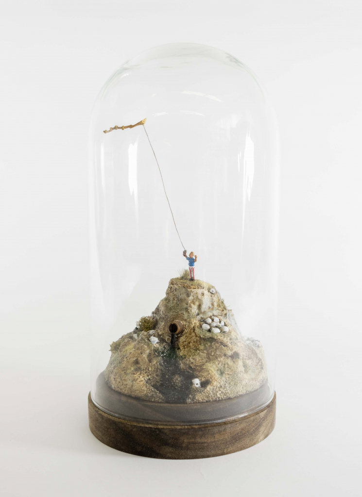 Olivier Roberge, Charnier #4 ou Maybe He’s Just A Big Kid That Only Cares For His Toys, 2017, sculpture en contreplaqué russe, styromousse, figurine HO, peinture acrylique, sable, flocage et autres matériaux divers, 20 cm x 12,5 cm x 12,5 cm.