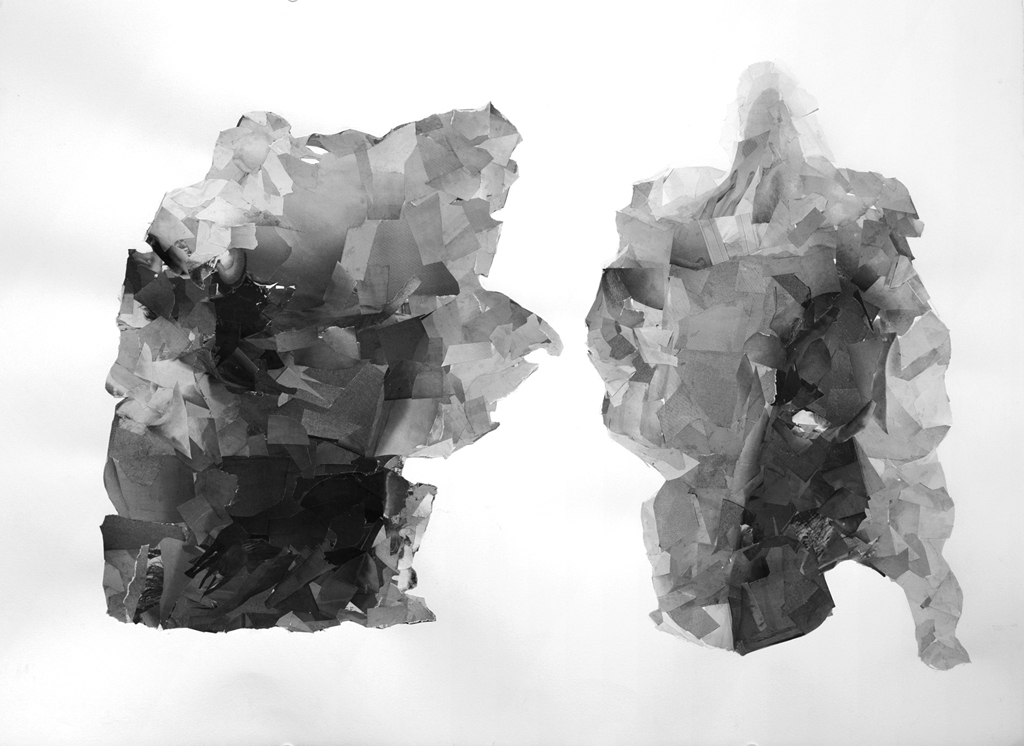 Annie Conceicao-Rivet, Étude des masses, dans la série Objets d’atelier, 2014, collage de papiers journaux et photocopies sur papier BFK Rives 250 g, 56 cm x 76 cm.