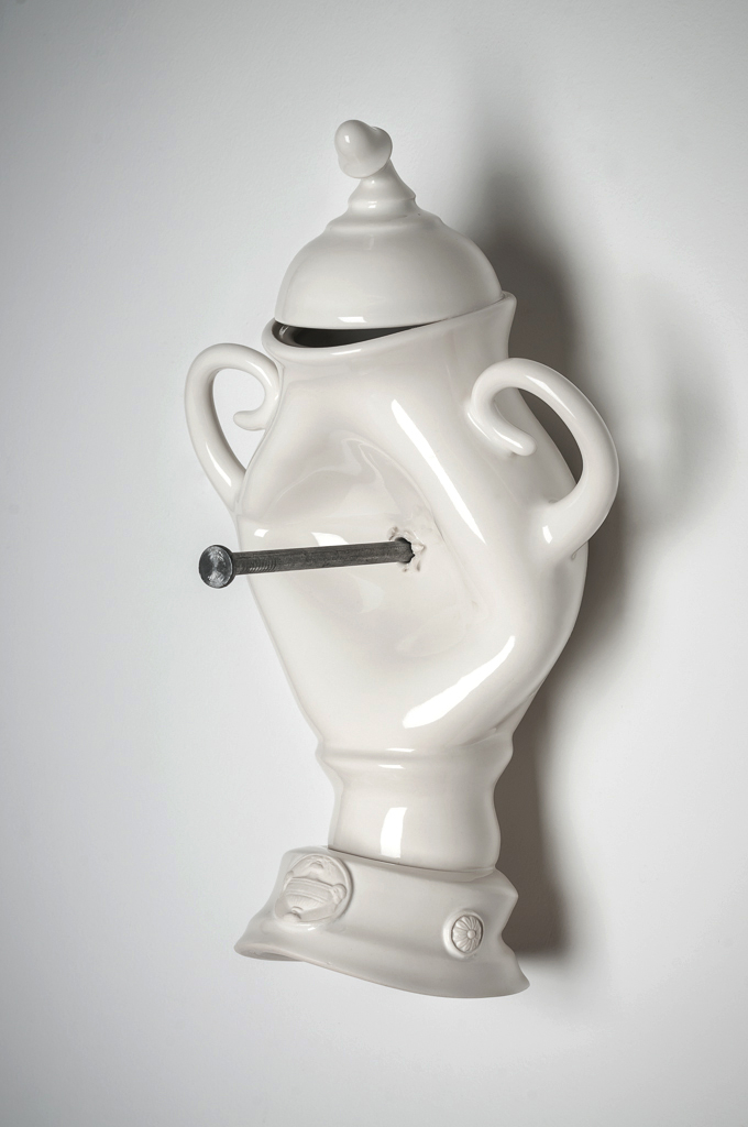 Laurent Craste, Entomolovase VI, 2013 (Edition d’artiste 2/2 éditée en 2017), Porcelaine, glaçure, clou, 30 cm x 19,3 cm x 17,6 cm.