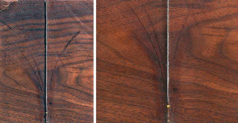 Éric Daudelin, Perthuis, 2012, noyer noire, laiton, crayon blanc, 15,3 cm x 11,5 cm x 1,8 cm.