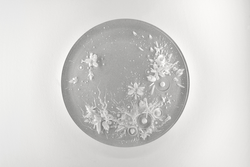 Laurent Lamarche, Fossile Pétri 7, 2017, plexiglas gravé, 20,5 cm de diamètre.