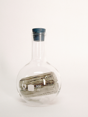 Julie Picard, Le Génie, 2017, fiole ballon en verre de 250 ml, papier journal, carton kraft, colle blanche sans acide, bouchon en caoutchouc, 8 cm x 15 cm.