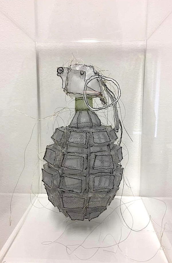 Jannick Deslauriers, Reliques: Grenade, 2017, crinoline, polyester, fils, 22 cm x 20 cm x 20 cm.