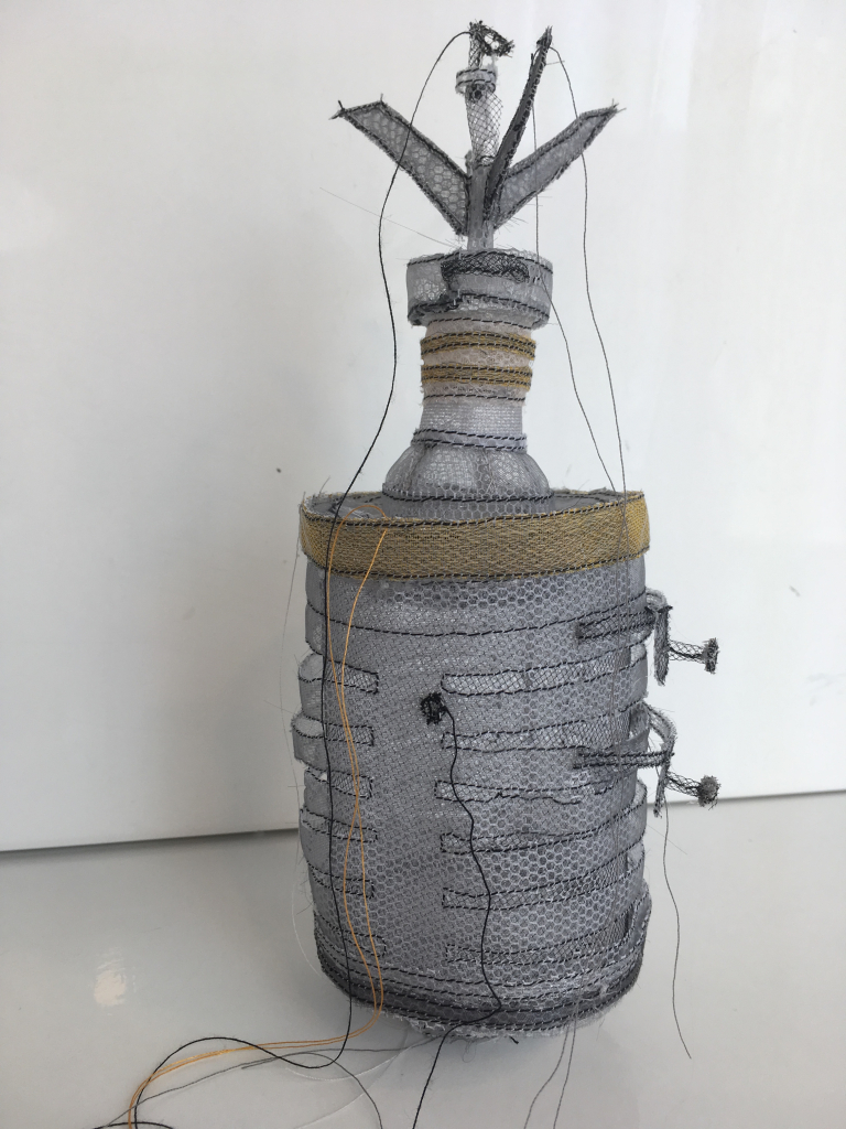 Jannick Deslauriers, Reliques: Mine antipersonnel, 2017, crinoline, polyester, fils, 22 cm x 20 cm x 20 cm.