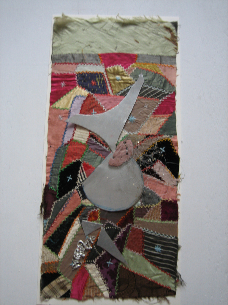 Janet Logan, Sampler Plus, 2017, collage assemblage : tissus, broderie, métal, céramique et perles sur papier, 77 cm x 35,5 cm x 10 cm.
