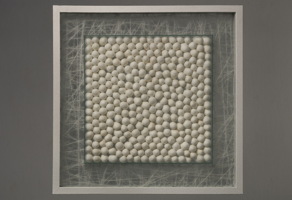 Lisette Lemieux, Trame soyeuse, 2017, cocons de soie, fil de soie et de mohair, verre, bois peint, 52,5 cm x 52,5 cm x 5,5 cm.