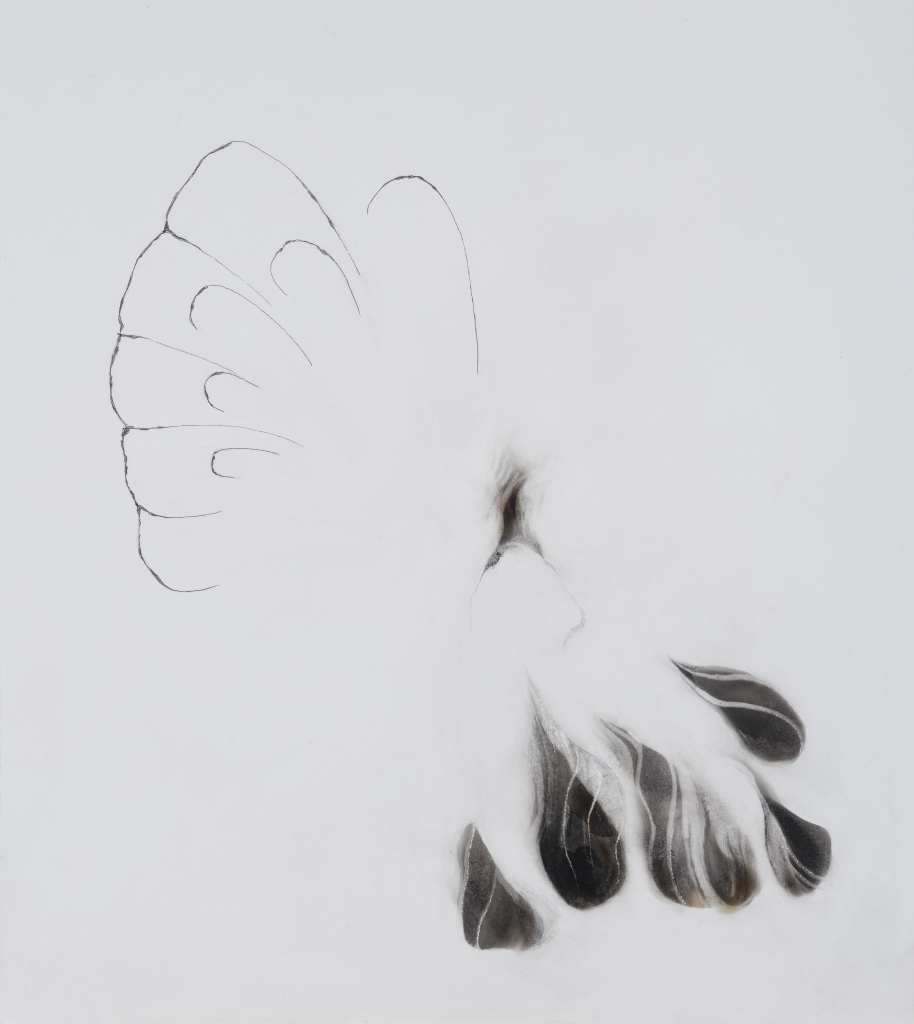 Louise Viger, Le moins et le plus – 01_Séparé du motif de tes ailes, 2017, suie, encre, graphite, fixatif pour médiums secs, papier Arches, 54 cm x 59 cm.