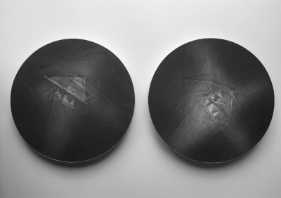 Yannick De Serre, Mémoire de deux lettres, 2017, gaufrage rehaussé au fusain compressé, marouflé sur Tondo de bois, dyptique. 2 cm x 25,5 cm de diamètre.
