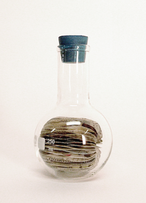 Julie Picard, Le Génie, 2016, fiole ballon en verre, papier journal, carton kraft, colle blanche sans acide, bouchon en caoutchouc, 10 cm x 17 cm.