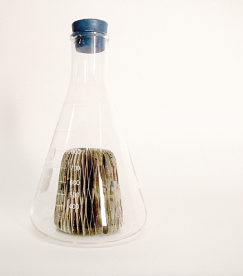 Julie Picard, Le Génie, 2017, Fiole Erlenmeyer en verre 1000 ml, papier journal, carton kraft, colle blanche sans acide, bouchon en caoutchouc, 2017, 12 cm x 22 cm.