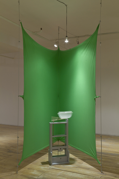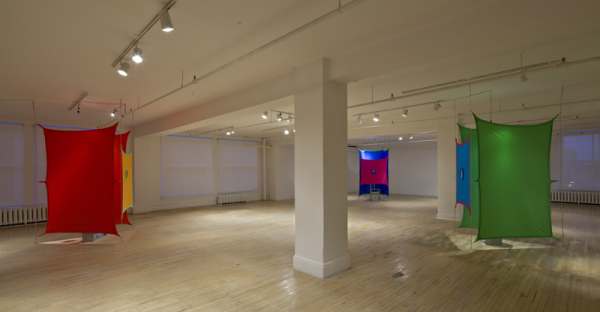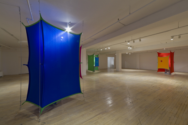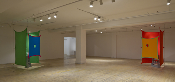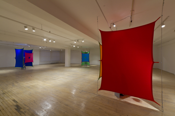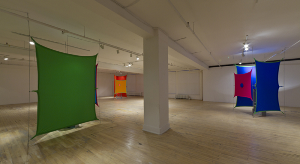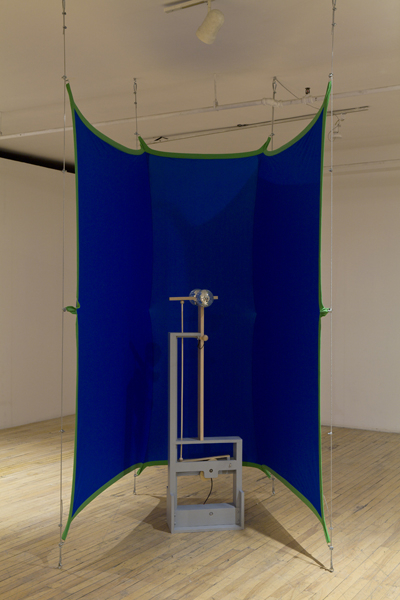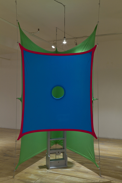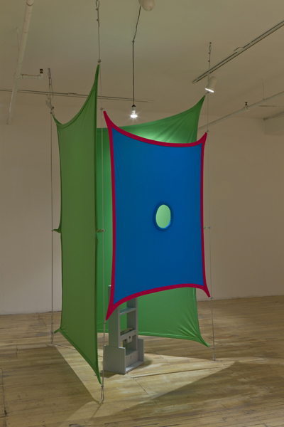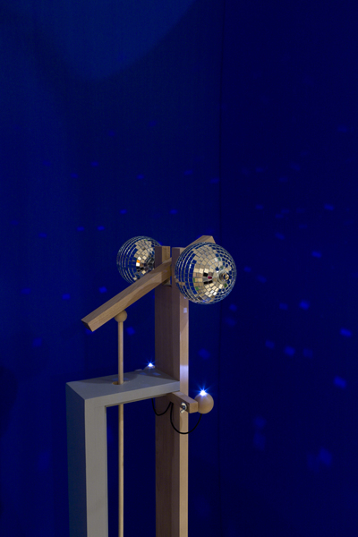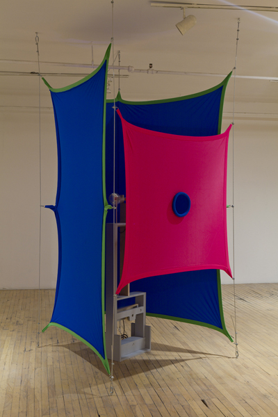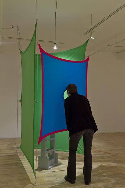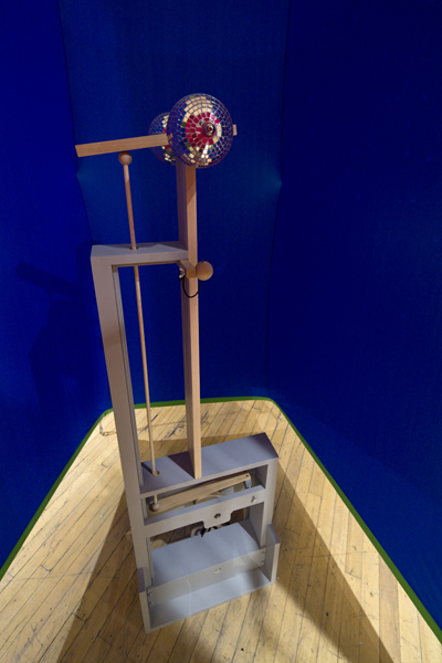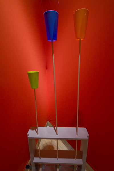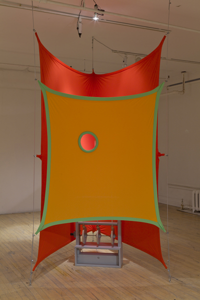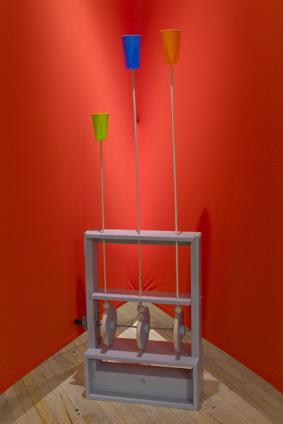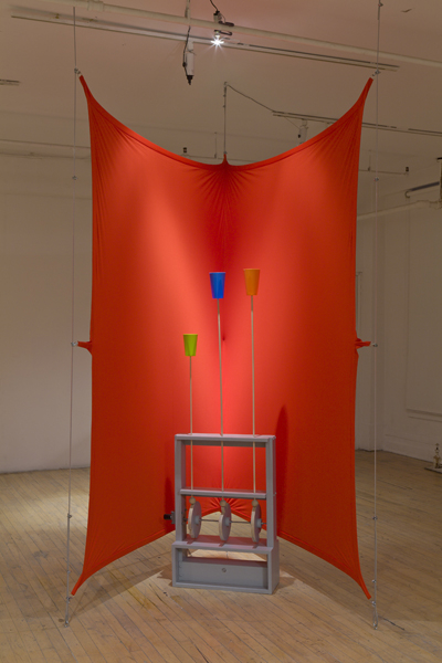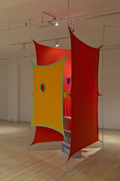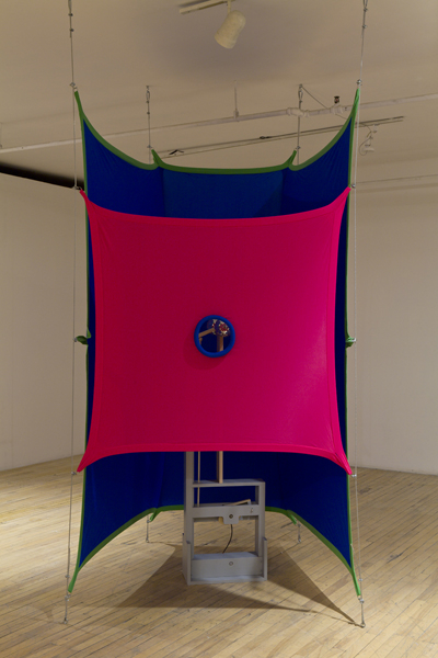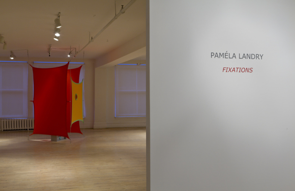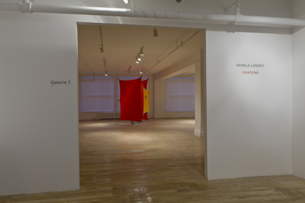 Fixations, installation sculpturale récente de Paméla Landry, est conçue pour le visiteur distrait. Envisageant la possibilité d’un spectateur ayant la capacité de s’abandonner à la magie des marionnettes, l’oeuvre se veut réparatrice, employant le spectacle comme moyen pour restaurer un état de grâce, du moins temporairement. En effet, à première vue, l’installation fait penser à un cirque ambulant, petite foire de curiosités mécaniques. Les Îlots – I, II et III –, structures en Lycra dont se compose la pièce et qui ressemblent à des tentes, sont de couleur orange vif, écarlate et vert lime, vermeille, turquoise et vert menthe, ou encore bleu roi et magenta, et les dispositifs mécaniques qui font leur « numéro » à l’intérieur vibrent, virevoltent et scintillent comme des danseuses sur une scène de burlesque. De plus près toutefois, si l’on regarde par le hublot de la cloison avant, ces divertissements semblent plus propices à la détente qu’à l’excitation. Les distractions à l’intérieur sont de simples jouets mécaniques – de minuscules moteurs animant des dispositifs en bois lisse qui font se trémousser des gobelets en plastique ou tourner des billes. Dans la plus spectaculaire de ces manifestations, un mécanisme fait tourner une petite boule miroir, projetant ainsi sur les surfaces intérieures de la tente un jeu de lumières en miniature.
