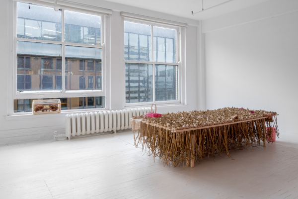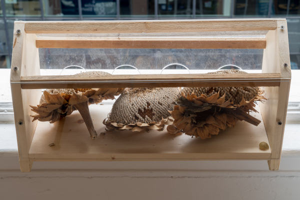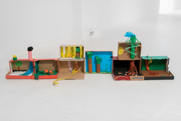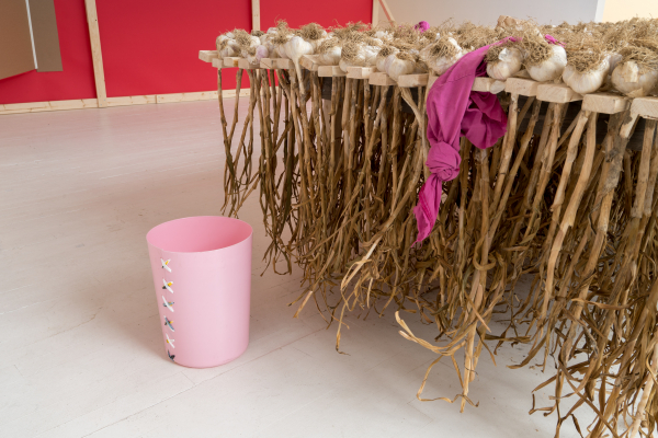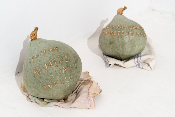 De ces interactions naissent des morphologies inattendues. Leyla nous demande de réimaginer des modèles d’enchevêtrements, des proximités non familières en réarrangeant qui et quoi ressort d’où, et quel type d’environnement pourrait surgir d’un glissement de frontières, d’une altération des échelles, d’une inversion des champs. Dans l’archive de ce jardin, des biomes habitent une boîte à chaussures. La façade d’une maison (un fragile rempart à l’intériorité) s’ouvre sur un champ d’ail. Une courge comme refuge, une galerie comme jardin.
