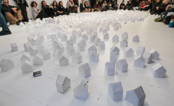 Les performances d’Echenberg se basent à part égale sur ces transformations subtiles et empreintes de tension, tandis que sont manipulés des objets fabriqués de matériaux usuels et fragiles comme le verre et le papier, et que la compression qu’elle exerce sur eux augmente et diminue très lentement, se soldant parfois par leur destruction. Ces objets deviennent alors de convaincantes métaphores pour la représentation de la maison et des relations qui en découlent.