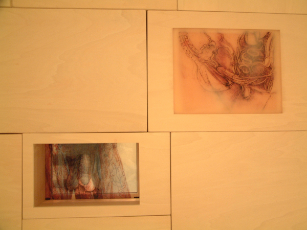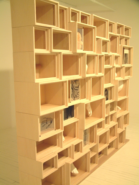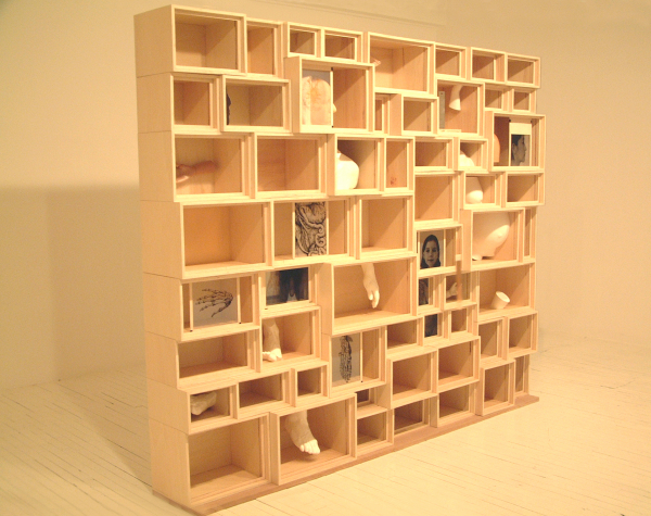 Les survivances se présentent souvent comme des structures fantomatiques dans les productions artistiques actuelles. Elles sont aussi ancrées dans notre perception. L’imager du corps, qui taillait autrefois l’image du corps idéal prescrit par son époque, s’est ici converti en véritable inspirateur d’images et de réflexions sur celles-ci. Des éléments de mesures corporelles, des reproductions de planches anatomiques anciennes ainsi que des empreintes du corps se côtoient et génèrent entre elles une négation de leur unique véracité. Les traces corporelles fossilisées dans le plâtre, la cire ou la photographie, engendrent à leur tour un questionnement sur les différents niveaux de réalité dont chaque médium peut apporter. On a déjoué le procédé traditionnel de mise au carreau par un quadrillage irrégulier, une grille tridimensionnelle créée par la superposition des boîtes. Mais l’image fractionnée par un tel procédé ne perd-elle pas ainsi un peu de son essence ? Les délimitations asymétriques entre les boîtes, contenant des empreintes isolées du corps, soulignent le caractère fragmentaire qu’engendrent toutes formes de ruptures à l’intérieur d’une image.