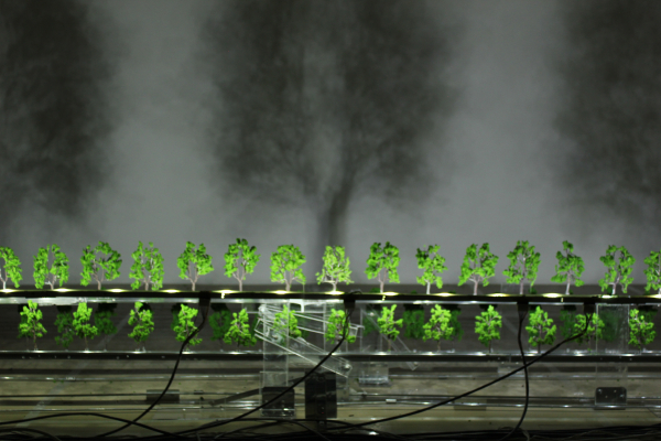 À l’aide de lumière DEL et d’arbres de maquettiste, l’artiste donne l’illusion du mouvement à des objets inanimés (comme avant elle les frère Lumière ou Thomas Edison). En résulte un véritable défilement de jeux d’ombrages qui crée des paysages et un tableau dynamique.