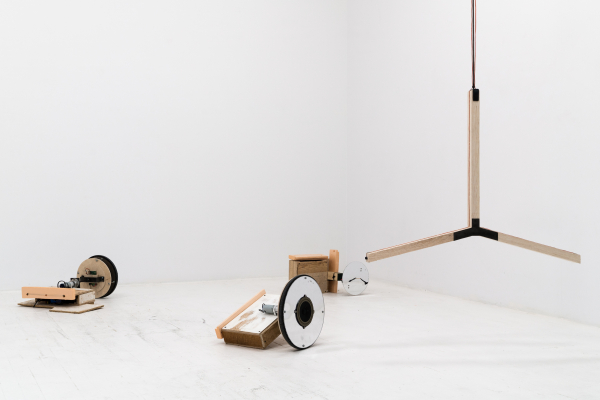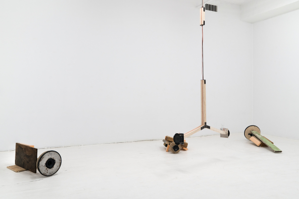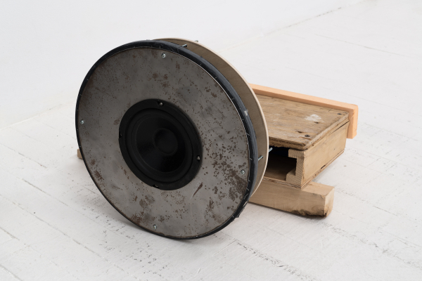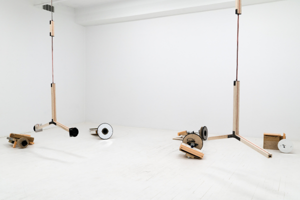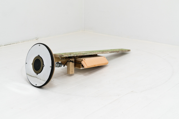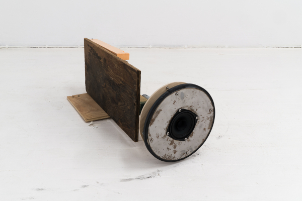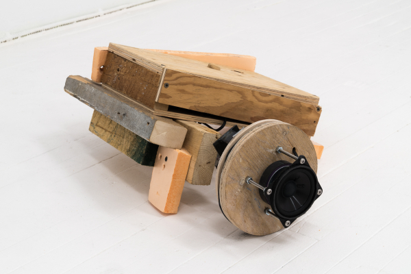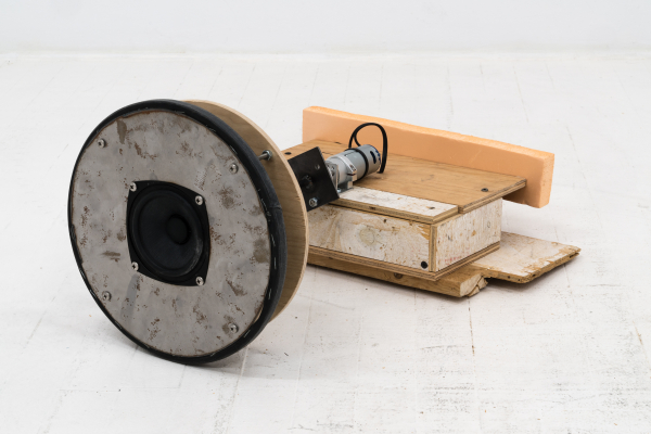 Le son occupe une place importante dans ce dispositif, où des microphones et des haut-parleurs captent et diffusent les sons que leurs mouvements dans l’espace génèrent. Les bruits sont de sources multiples : des appareils suspendus au plafond tournoient à un rythme régulier, alors qu’au sol, des objets-machines sur roues se déplacent de manière erratique. Selon que ces objets soient équipés d’un micro ou d’un haut-parleur, et tout dépendant de leur trajectoire, les bruits des moteurs, des roues sur le plancher, le bruissement des fils dans l’air sont amplifiés, se contaminent en réverbérations qui poussent le matériel jusqu’à ses limites technologiques. En effet, l’épuisement des matériaux, allant parfois jusqu’à se détruire, est au cœur de l’approche de l’artiste; en créant des objets bruts, considérés d’emblée comme précaires ou fragiles, elle déjoue l’apparente invulnérabilité que la technologie peut conférer à des œuvres qui semblent destinées à fonctionner toutes seules indéfiniment. Ici, des signes subtils comme l’usure du plancher, contribuent également à marquer la mise en tension entre création et destruction (est-ce une forme de dessin, ou plutôt un bris?), une dualité parfois présente dans les œuvres qui se déploient dans la durée.