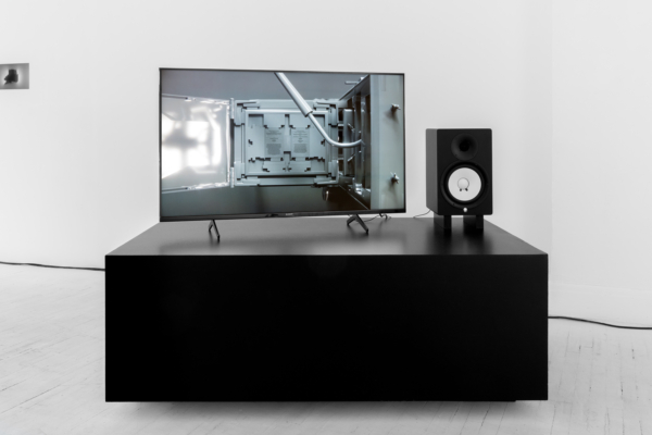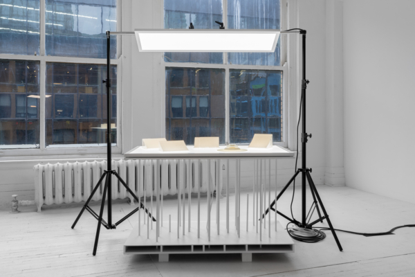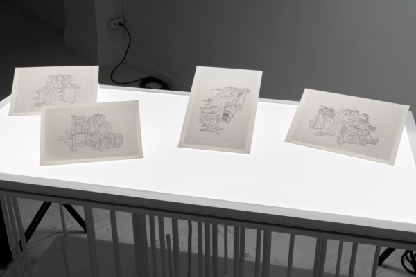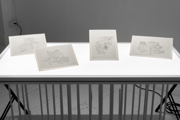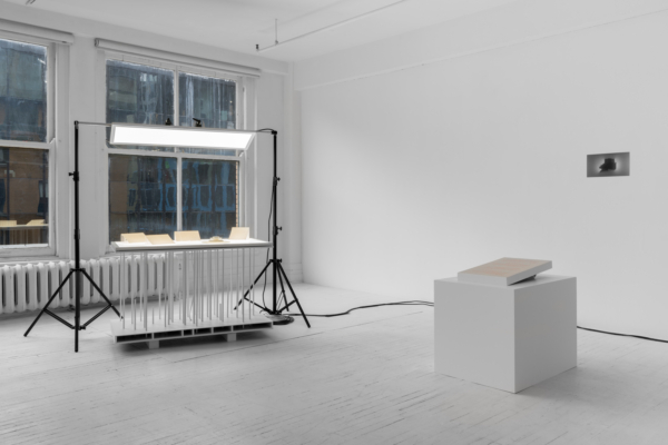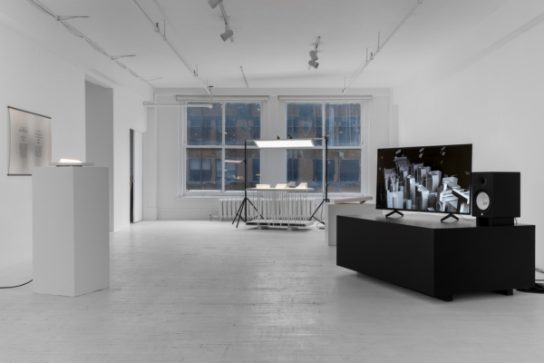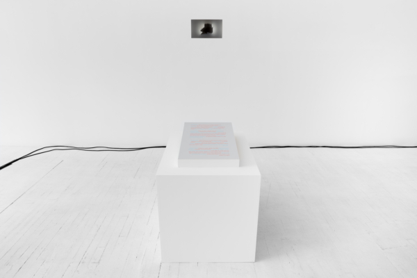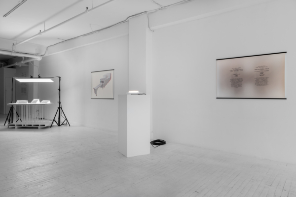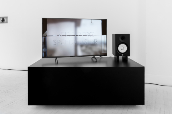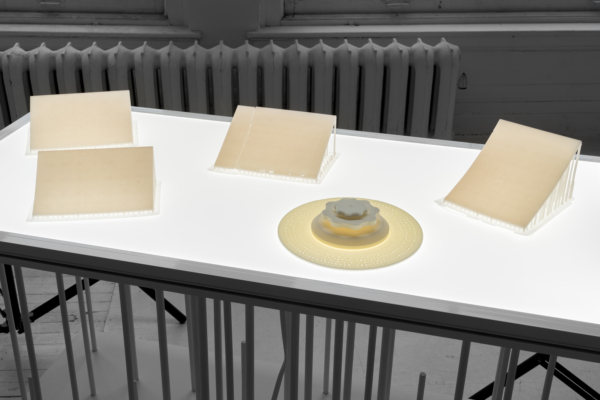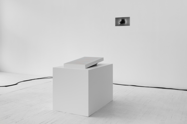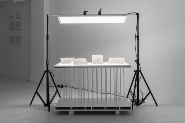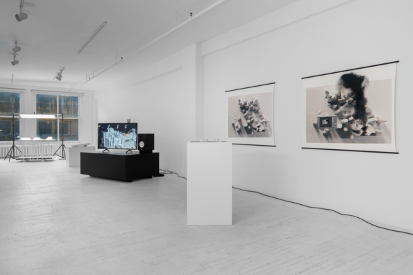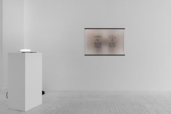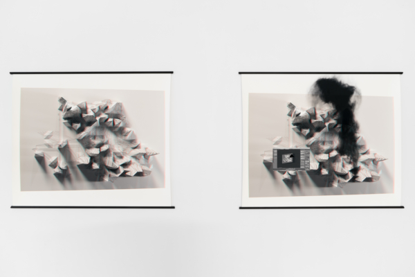 L’œuvre d’animation 3D articule ces enjeux avec une acuité particulière. Comme le suggère le titre INTERTYPES, entre les types et les périodes se trouve toujours un chemin continu ponctué d’ancrages historiques. Une machine Canon VarioPrint i300 industrielle émerge d’une flaque de résine liquide telle la matérialisation d’une impression 3D; de la lumière traverse le disque circulaire d’une imprimante Lumitype-Photon, machine iconique commercialisée en 1956 qui déplaça la composition typographique vers la photocomposition; nuages de fumées et de poudres, évoquant le noir de fumée, base historique de l’encre noire et de l’impression. Croisant et entremêlant ainsi les époques, les histoires, les lumières, les encres et les résines, l’œuvre suggère une forme de narration science-fictionnelle, qu’amplifie une temporalité ralentie. Ce panorama semi fictif contient et déploie néanmoins un pan de l’histoire : celui des connaissances, des développements technologiques et de la contestable idée de progrès, qui trouvent leur ancrage à travers les indices matériels de la reproductibilité technique.