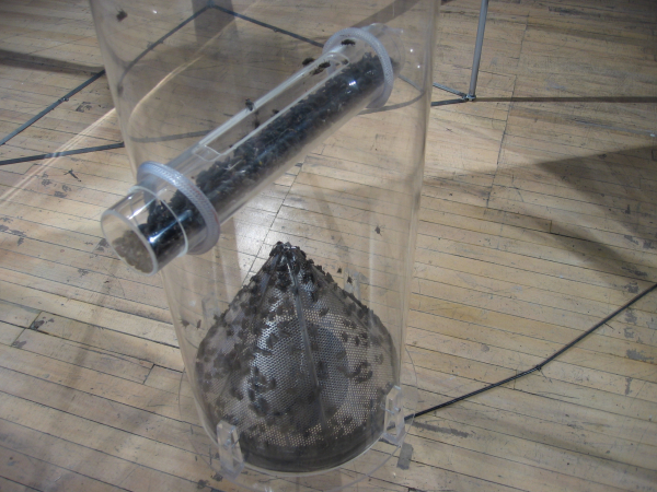 Chaque partie de l’installation semble dériver d’expérimentations primaires sur le phénomène du son, de la conception du temps, à partir d’une réflexion du cycle de la mouche. Il s’agit d’une sorte de mise en contexte qui vise à scénographier le concept de la mort.