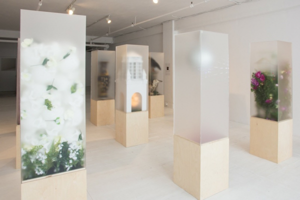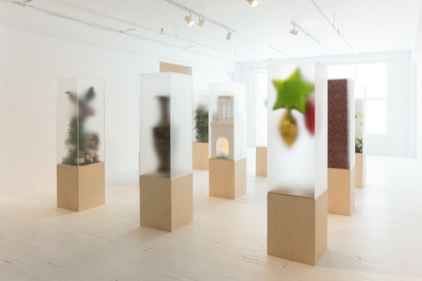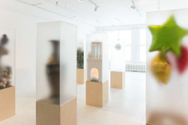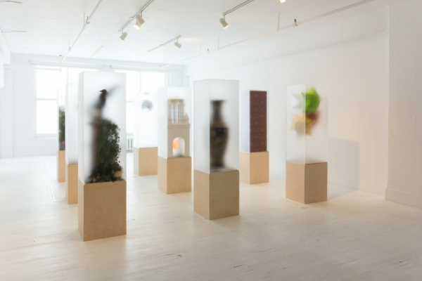 La surface dépolie des prismes nous présente ces compositions de manière floue, voire effacée. Les compositions sculpturales se présentent ainsi à nous sans qu’on puisse les voir complètement, comme si chaque surface devenait un écran en basse résolution. À l’envers du roman d’Huxley, où chaque individu est créé dans un bocal dans des conditions qui lui permettront d’être identique à son prochain, ici, chaque prisme nous présente une amorce vers un imaginaire se distinguant des autres.