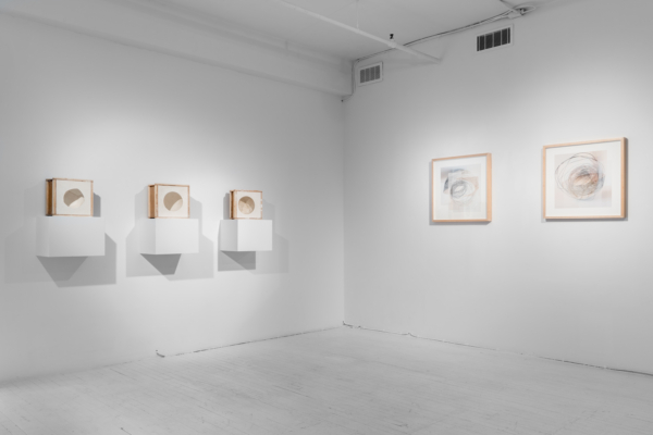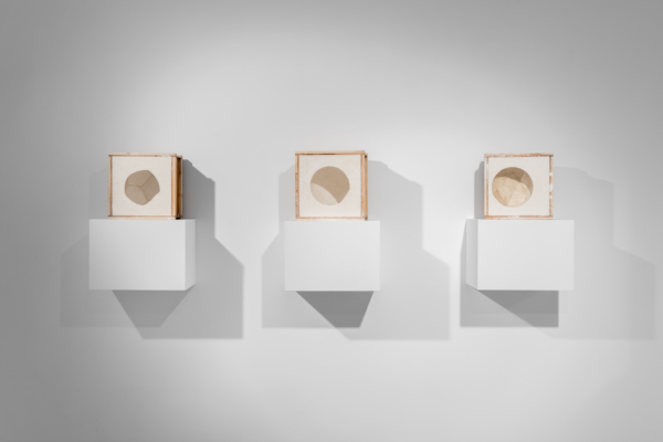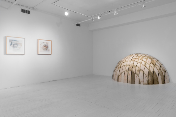 Dans l’exposition, l’artiste place la sphère comme entité à part entière, laissant derrière elle sa construction. Il lui accorde une indépendance qui lui permet ainsi d’être et d’exister. Avec L’aire d’une sphère, la masse nous fait face, générant une expérience de frontalité inhabituelle. Deux corps se confrontent. La présence imposante de la masse du dôme aurait-elle préséance devant celle du spectateur? Tandis que le corps de la sphère fait ici acte de présence, l’absence domine dans la série Petits lacs. Dès lors, l’empreinte de la forme fait œuvre de mémoire de la matière et le corps devient personnifié. Grâce à ce contraste, un jeu s’installe et invite le spectateur à des questionnements sur l’essence de la sphère. Comment existe-t-elle? Par chevauchement de couches. C’est du moins ce que suggèrent les Vues alternées sur un dôme alternatif. Les deux œuvres présentées sont faites de superpositions d’images qui représentent des éléments présents (bobine de fils, repères, sphère et demi-sphère) dans l’atelier de l’artiste. La profondeur de la masse se voit à travers la transparence des couches qui donnent à voir l’histoire d’une prise de forme à travers le geste du sculpteur.