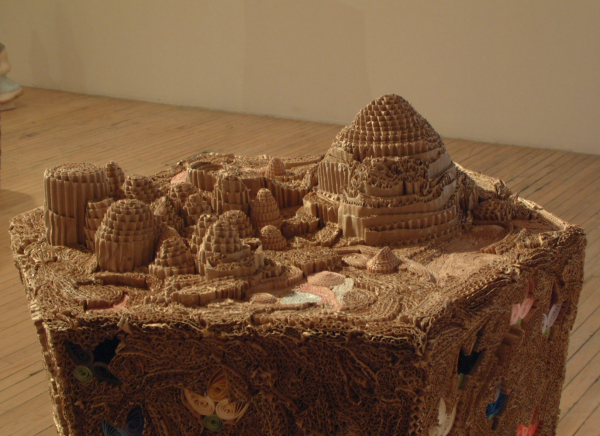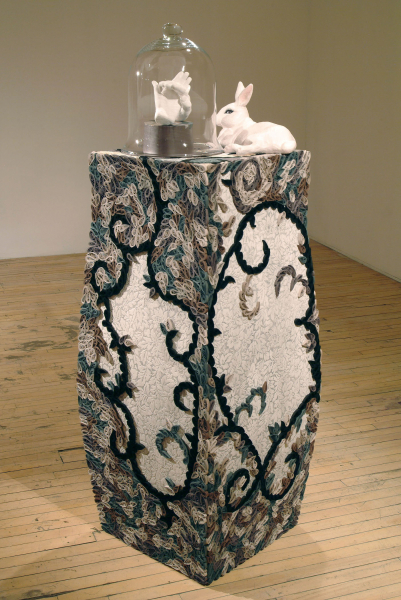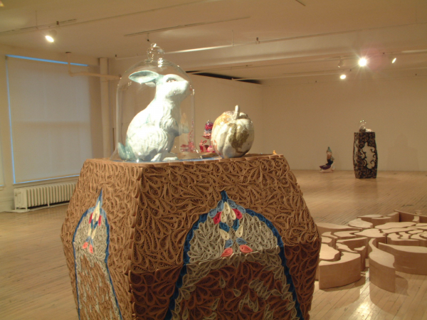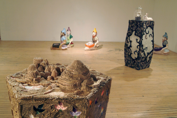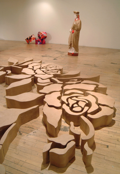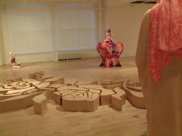 Polychrome, éclaté, contrastant, l’art du motif fait de ce nouvel univers celui de l’expression des débordements, des excès de la séduction, de la sinuosité des passions. Il convie à l’exaltation et à la surprise par l’accumulation et l’hybridation des techniques, par la simplicité des matériaux, populaires, presque primaires, qui se jouxtent les uns aux autres dans la construction de masses complexes et hétérogènes. Le travail de l’ornement, ici, s’adresse directement à la gourmandise du regardeur. Il l’initie à une démarche essentiellement physique de la réception qui l’inscrit dans un rapport aux sens où l’amour devient une véritable solution au mal de la société et se présente d’instinct comme un besoin inéluctable, délicieux au centre de la vie, au centre de l’art.