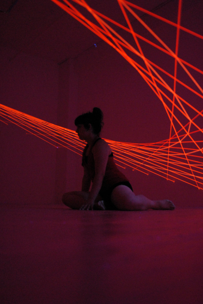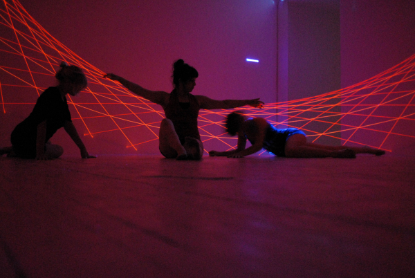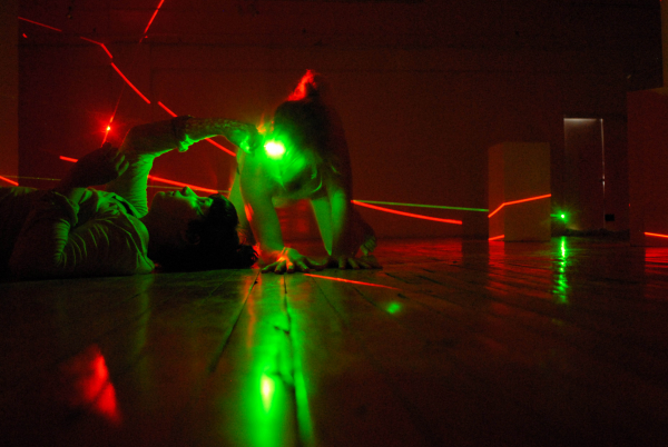 Nous ne percevons visuellement que par la lumière qui vient frapper notre rétine. En général, dans une pièce éclairée par exemple, les rayons lumineux de la source partent dans toutes les directions et s’en vont réfléchir sur les objets puis finissent par aboutir sur notre rétine. C’est la raison pour laquelle nous les percevons. Les flux de lumière reçus par la rétine nous renseignent sur leur forme. Si la source est très localisée et unidirectionnelle (comme un rayon laser) nous ne percevons qu’un point (si il n’y a pas de fumée ou brouillard qui permettent, alors, de percevoir la ligne droite du rayon… pour peu que le laser soit assez puissant et la densité de fumée ou brouillard suffisants). Imaginons, par un procédé technique, d’avoir une source lumineuse qui ne soit plus un seul rayon laser mais un plan de rayons lumineux ( un exemple, fréquent maintenant, se trouve dans les traceurs lasers que l’on trouve dans le commerce pour tracer l’horizontale en remplacement des niveaux à bulle). Lorsque la rétine captera de la lumière ce sera alors une ligne qu’elle percevra… et rien d’autre : l’intersection de ce plan avec la surface qui lui fera obstacle. Il faudrait certainement enfoncer plus loin le bouchon pour être précis… l’objectif n’est pas de faire de la science mais d’en user à des fins émotionnelles et ces remarques sont suffisantes. Si la salle est vide nous ne verrons que la trace sur les murs. Imaginons qu’une personne (différente de vous qui observez) se déplace dans la salle : vous percevrez un segment de ligne courbe, mobile dans l’espace, et ce qui reste de l’intersection avec les murs, immobile. Si nous avons la chance d’avoir un ensemble de personnes en un mouvement chorégraphié nous aurons un ballet de lignes dans un plan. Nous pouvons multiplier les plans de lumière et ainsi complexifier ce ballet.
