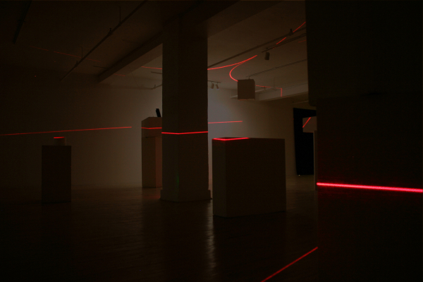 Imaginons que nous soyons dans une obscurité suffisante qui ne permette plus de discerner les objets qui habitent la salle. Notre seul moyen de nous repérer dans cet espace sera de nous appuyer sur les éléments visibles. Si les seuls éléments visibles sont les segments définis par ce plan sécant, notre oeil, par nécessité et absence de distraction, va découvrir et goûter une information sensible et plastique qui n’est qu’une matHérialisation ou manière de rendre concret un concept banal, dans une situation particulière. Tout l’art demeure dans la manière de rendre cela poétique et/ou émouvant.